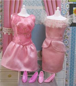 Up for sale is a cute set of Mattel fashion outfits. This ensemble includes 2 party dresses with matching pink pumps in great played with condition. (one has a ruffle off shoulder with fitted skirt flounce). The mannequins are not included. ...a purple Barbie Tag inside. Sparkle pretty fashions are known for being easy to dress your Barbie dolls.