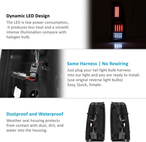 ✅ [𝗗𝗶𝗿𝗲𝗰𝘁 𝗢𝗘 𝗳𝗶𝘁𝗺𝗲𝗻𝘁] - Tail light assembly perfectly compatible with 1999-2006 Chevy Silverado 1500/1500 HD/2500/2500 HD/3500, 1999-2002 GMC Sierra 1500/2500, 2001-2002 GMC Sierra 3500. Tail lights are sold in a pair: include left side (driver side) and right side (passenger side). Please confirm your vehicle’s year and model before purchase.