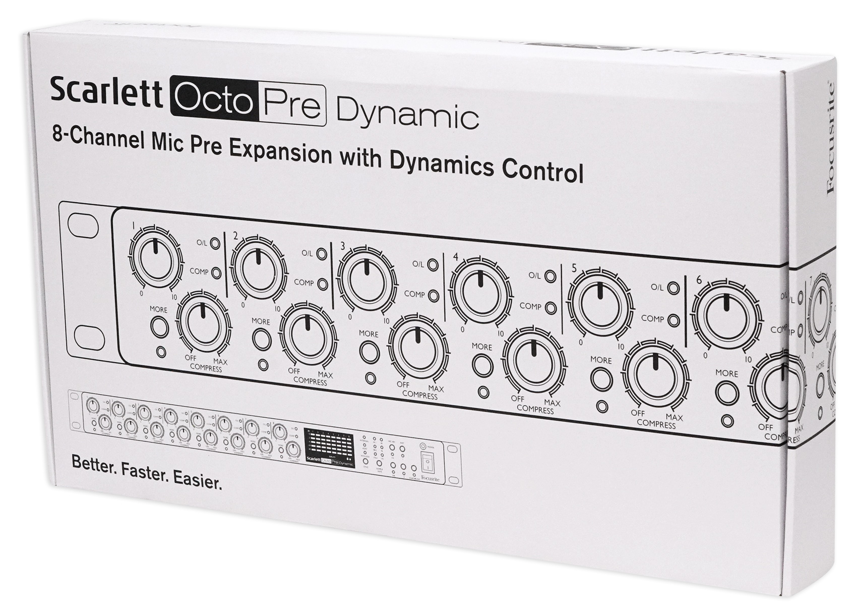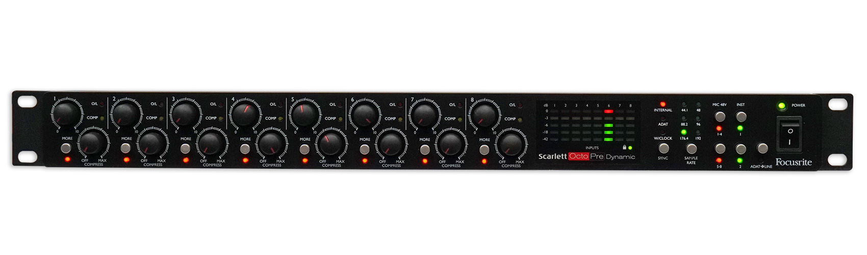 Featuring eight channels of Focusrite's 2nd generation Scarlett preamps and a soft-knee VCA compressor on every channel. Scarlett OctoPre Dynamic lets you control the dynamics of all your input signals with an easy-to-use single-knob analogue compressor on every channel. There's a transparent mode for subtle compression plus a "More" button that doubles the ratio for compression with effect.