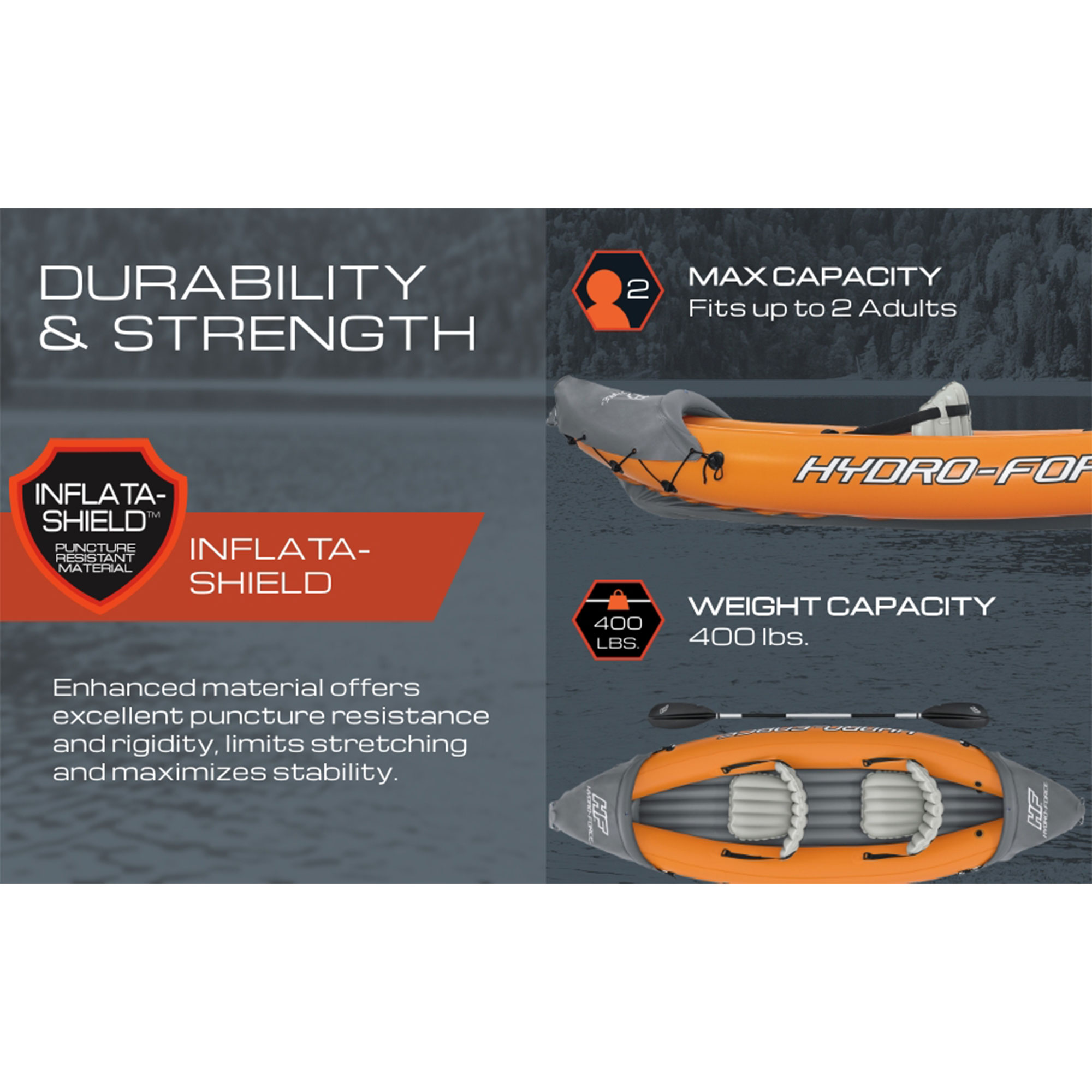 Ideal for adventurers of all stripes, this inflatable kayak comfortably accommodates two adults (with a combined weight capacity of up to 397 pounds), ensuring memorable experiences on any waterway. Crafted with our cutting-edge Inflata-Shield material, it boasts unparalleled durability, resisting punctures, minimizing stretching, and providing enhanced grip for maximum stability.