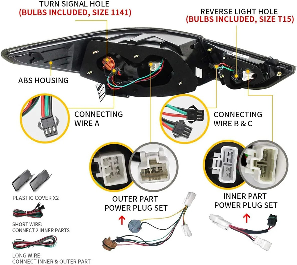 The package includes: 1 pair of headlights and 1 pair of taillights and 1 pair of LED bulbs.