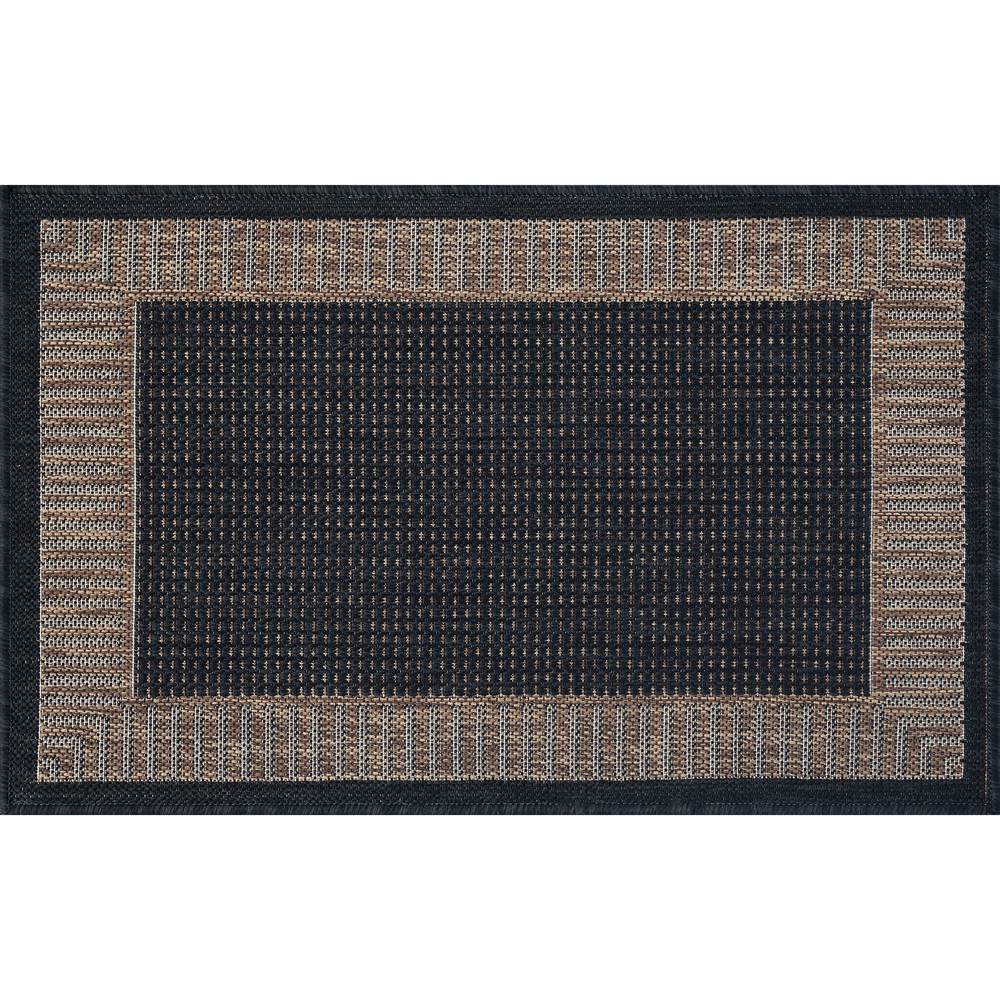 Enhance any setting with this Greek Key classic indoor outdoor endurance area rug. Solid center and intricate border give a Mediterranean feel in fresh color. Treated fibers resist staining and fading, this rug is built to perform. Perfect for a family room, sunroom, porch, deck, den, living room, playroom, nursery. May be cleaned outside with mild detergent and garden hose, allow to dry thoroughly. Size Range: 2' x 3', Color Family: Blacks & Grays, Material: Cotton, Shape: Rectangle