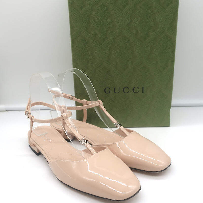 Gucci Double G T-Strap Ballet Flats Nude Patent Leather Size 37.5 NEW