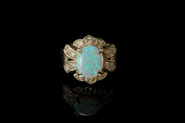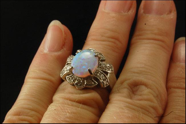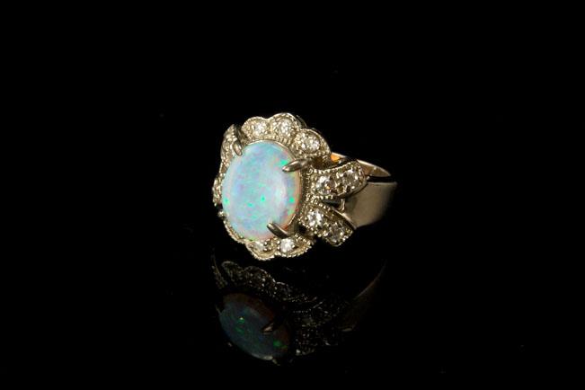 This is a very beautiful, vintage and unique OPAL DIAMOND CUBIC ZIRCONIA 925 STERLING ring c. 1950 size 5 1/2 (weight 6.8g). The ring has a marvelous shape with fantastic blue opal (11 x 8 mm), cubic zirconia (1-1.5 mm) and 925 sterling. The ring has a very extravagant and elegant feel to it. The ring is in very good condition.