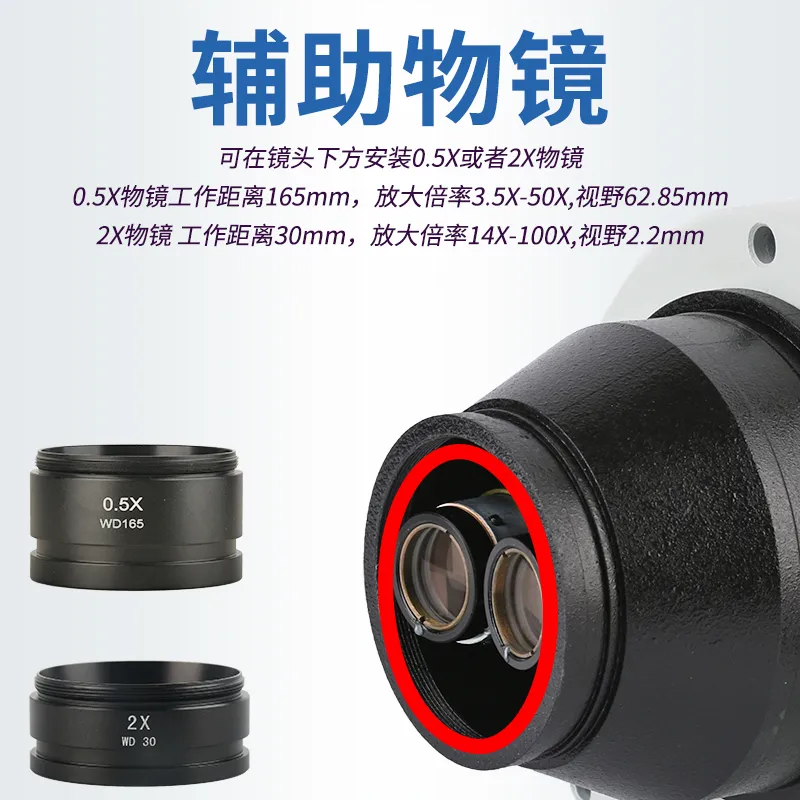 | Auxiliary Lens | 0.5X/165mm,2X/30mm |