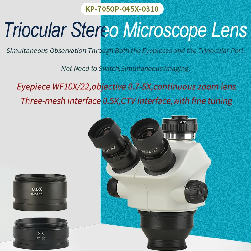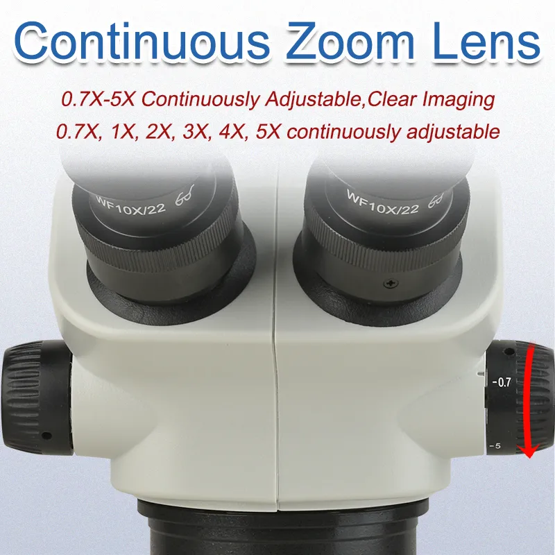 | Packing List | 1、Eyepiece WF10X/22mm One Pair 2、Eye Guards One Pair 3、0.7X-5X Zoom Lens *1 4、Dust Cover *1 5、Trinocular Interface 0.5X *1 6、Spanner *1 7、0.5X Auxiliary Lens *1 8、2X Auxiliary Lens *1 |