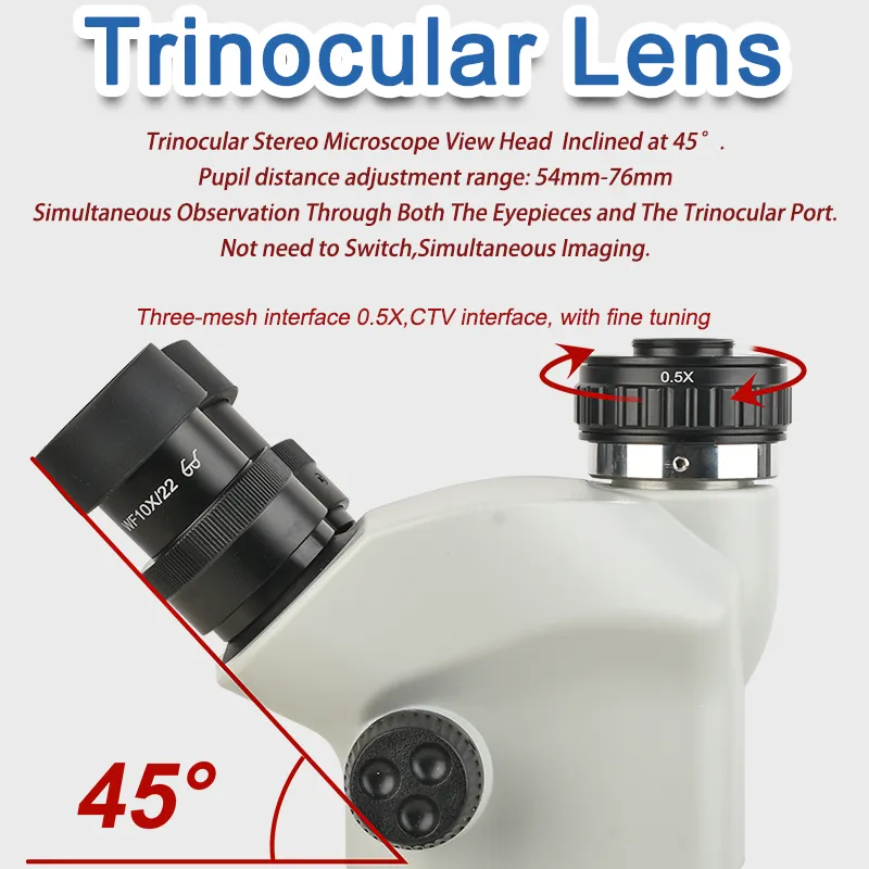 | Viewing Head | 45 ° Tilting Trinocular Observation Head,Interpupillary Distance Adjustment:54mm-76mm,Simultaneous Observation Through Both the Eyepieces and the Trinocular Port.Not Need to Switch,Simultaneous Imaging. |