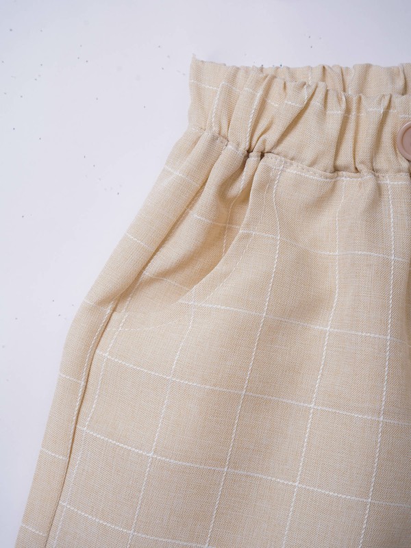 Solid shirt has short sleeve, button down and bow tie. Plaid vest has decorative pockets. Plaid shorts have pockets.