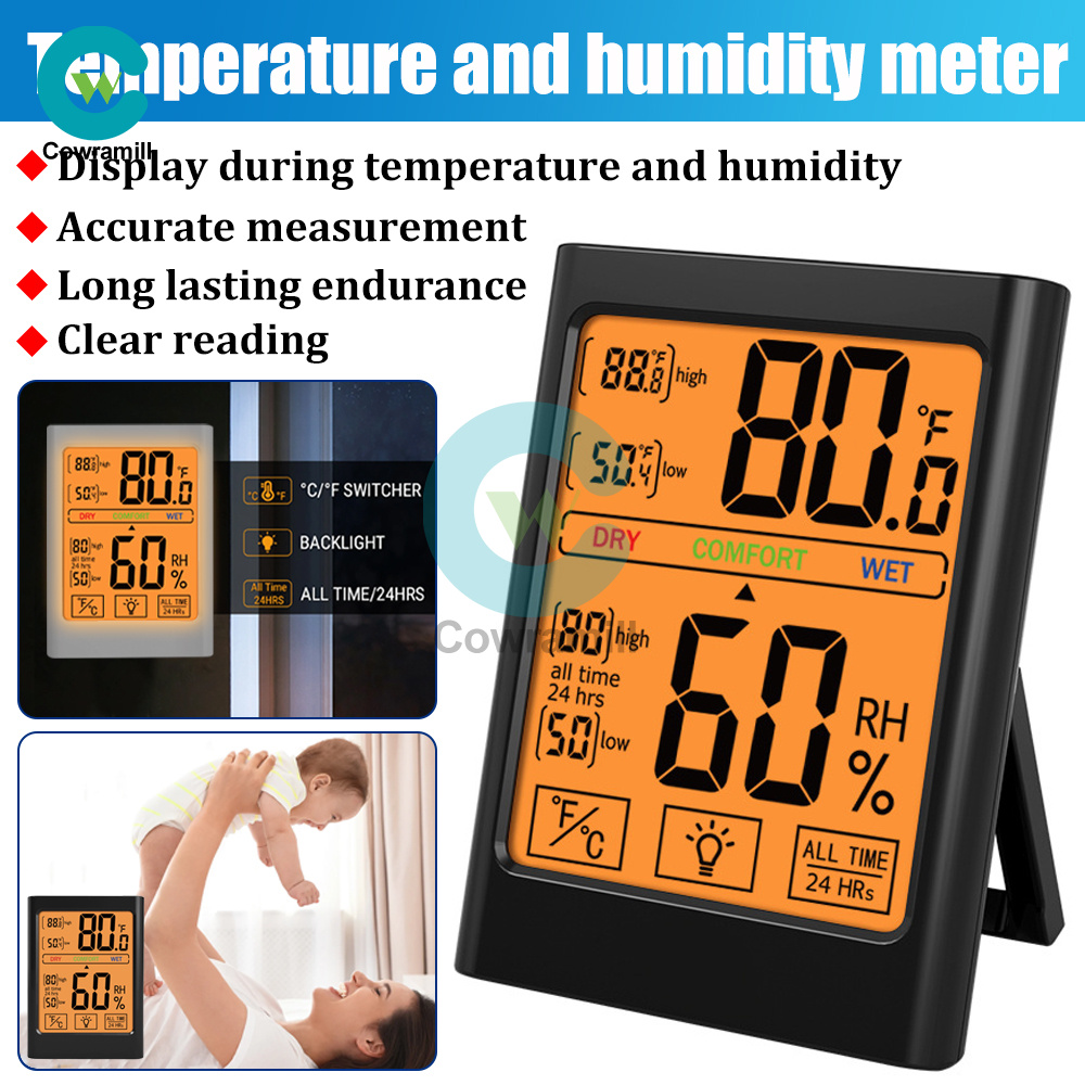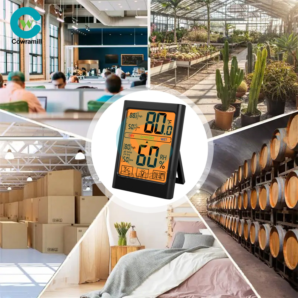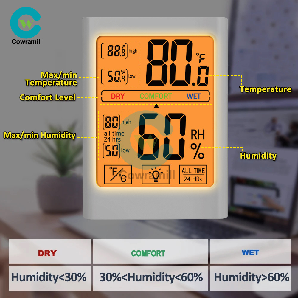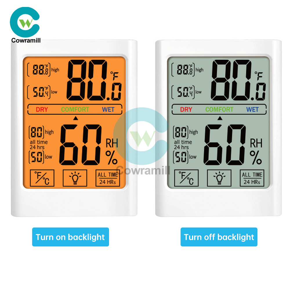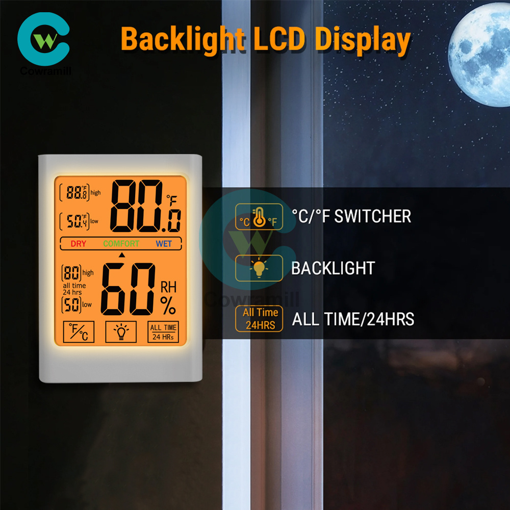 Features: Temperature, humidity, magnetic suction, touch screen, backlight, bracket, hanging hole, ° F/° C switching, 24-hour maximum and minimum temperature and humidity recording.