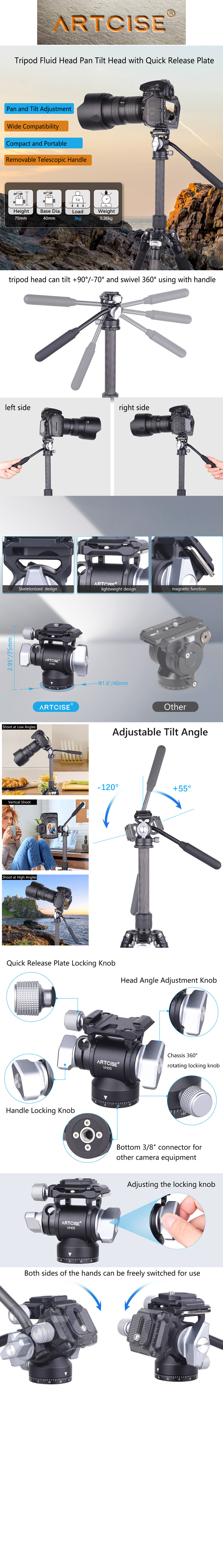 Compact and Portable: ARTCISE VH05 video head is a compact fluid video head that weighs only 360g / 0.8lb, but it can load up to 3kg / 6.6lb. It features a 75mm height and a 40mm base diameter, making it incredibly portable.