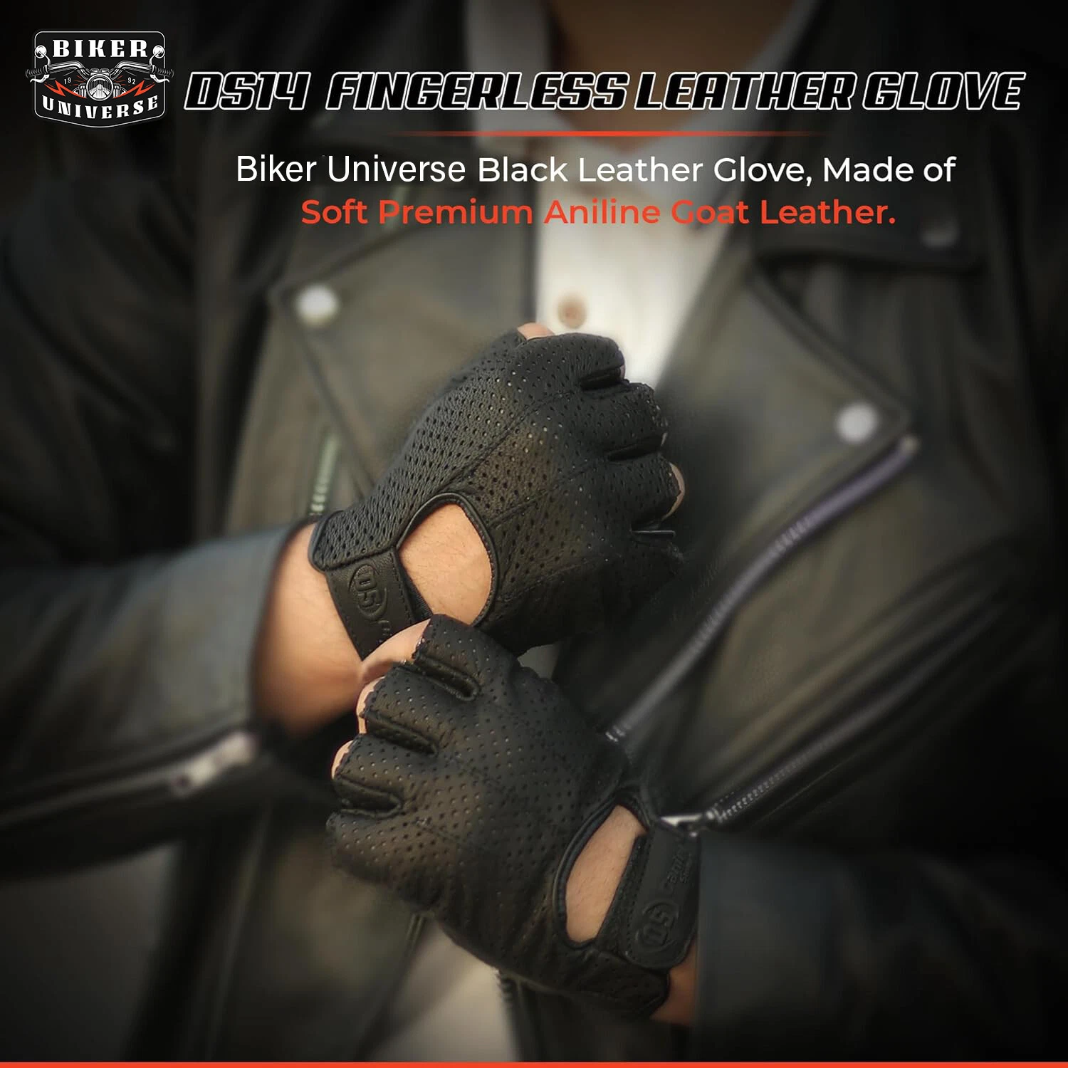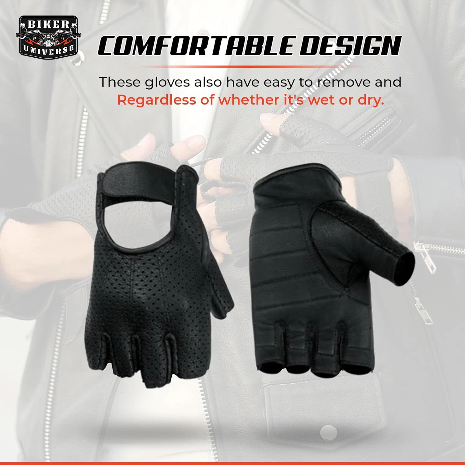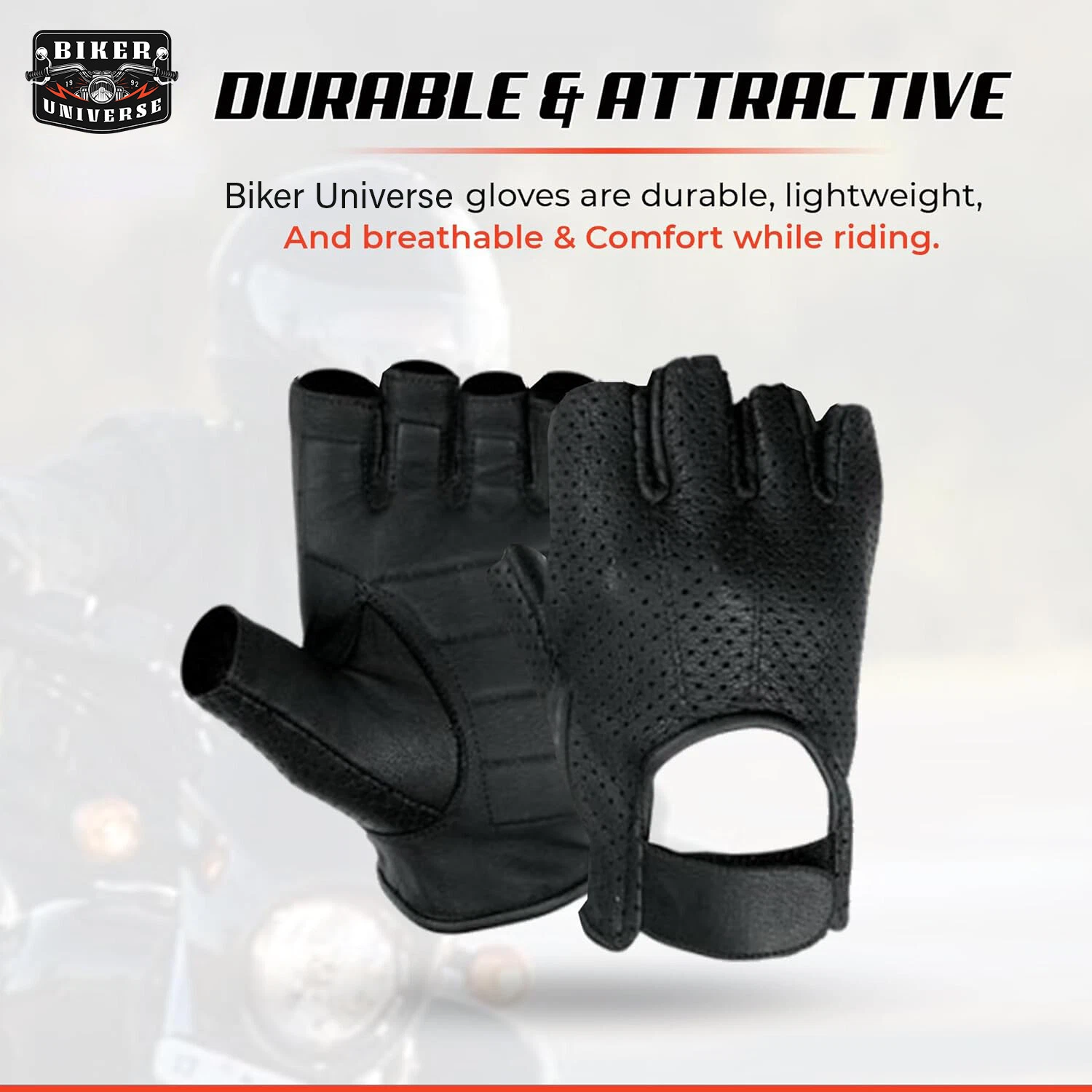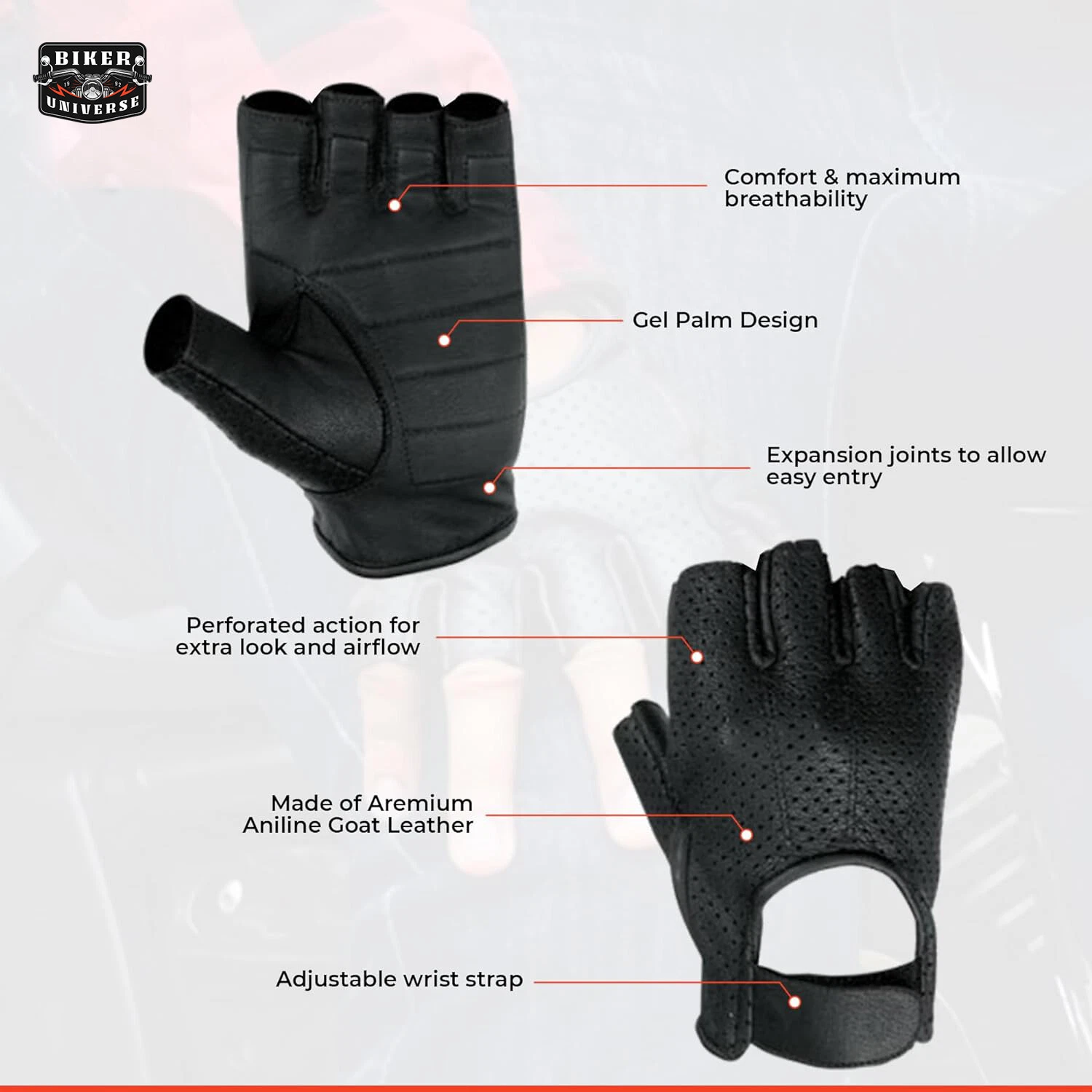 - Premium Deerskin Leather: Biker Universe Fingerless Motorcycle Gloves are made of excellent Aniline Goat leather that provides natural protection and will not tear or crack when exposed to conditions like sunlight, heat, or moisture.
