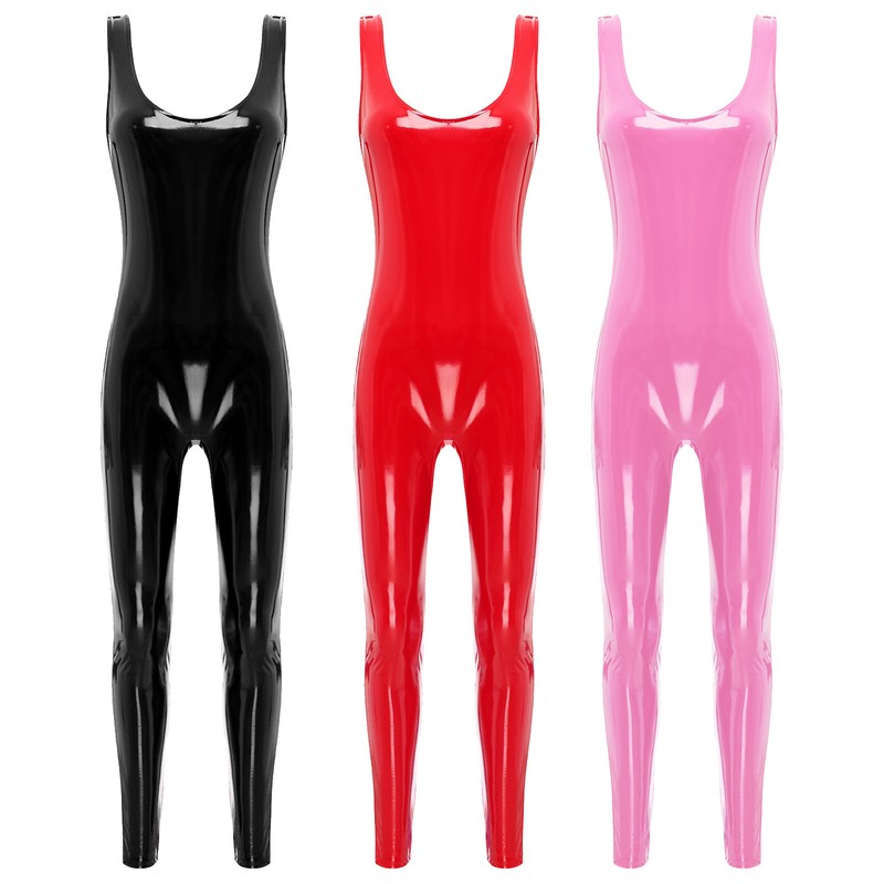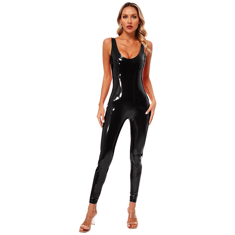 DE Damen Hosenanzug Overall Wetlook Slim Fit Catsuit aus Lackleder Clubwear