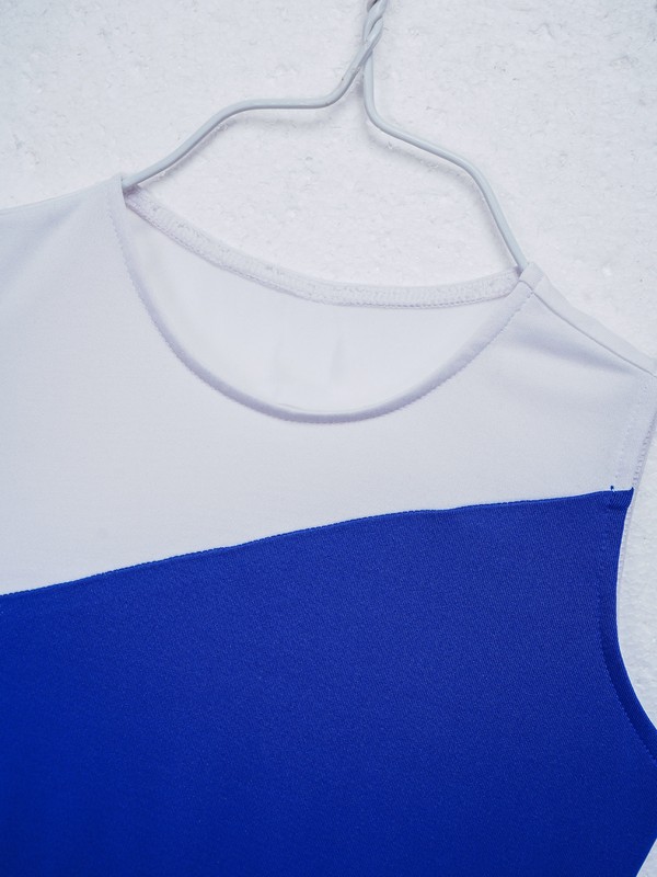 Sleeveless and regular round neckline design, fashion contrast color and patchwork, shiny bronzing cloth at waist.