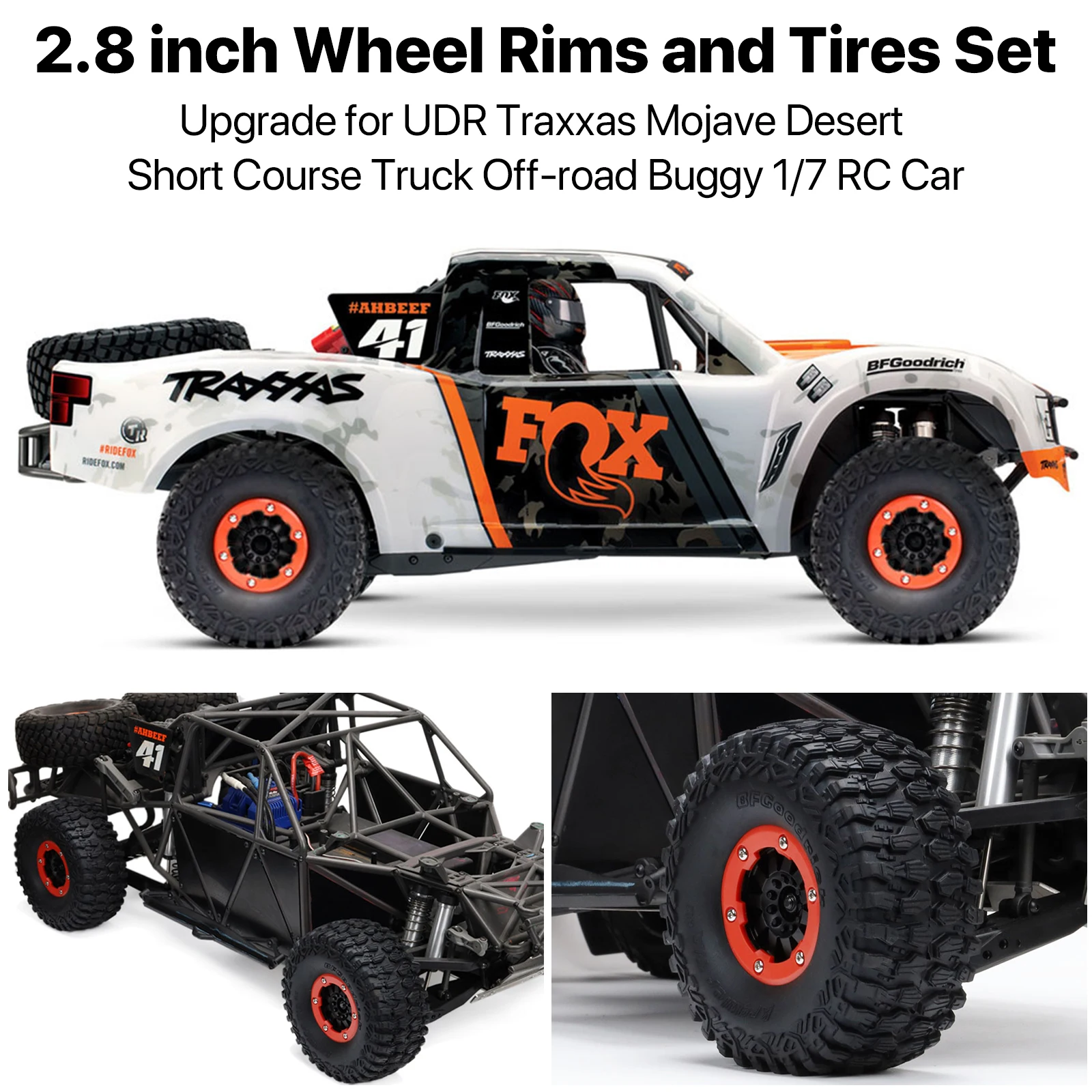 17mm Hex RC Wheels and Tires 2.8in are suitable for 1/7 Mojave Desert Short Course Truck UDR Traxxas Off-road Buggy RC car upgrades.Highly detailed sidewall for scale looks.Stepped blocks & amp; Multiple sipes create unmatched grip.Tackle tough terrain in scale style.Beadlock design, don't need to glue.Ready to use!