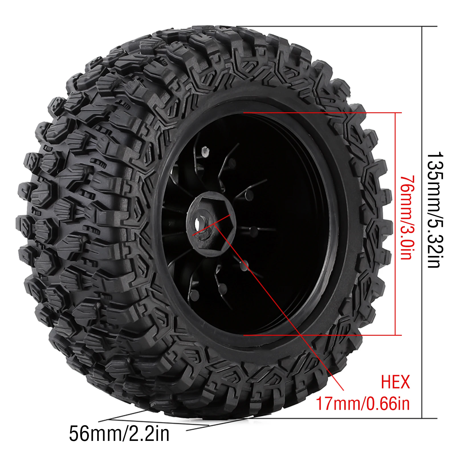 1.RC Vehicle Wheels and Tires Size: Tire diameter: 135mm Tire width: 56mm Wheel Hub diameter: 76mm Adapter: 17mm