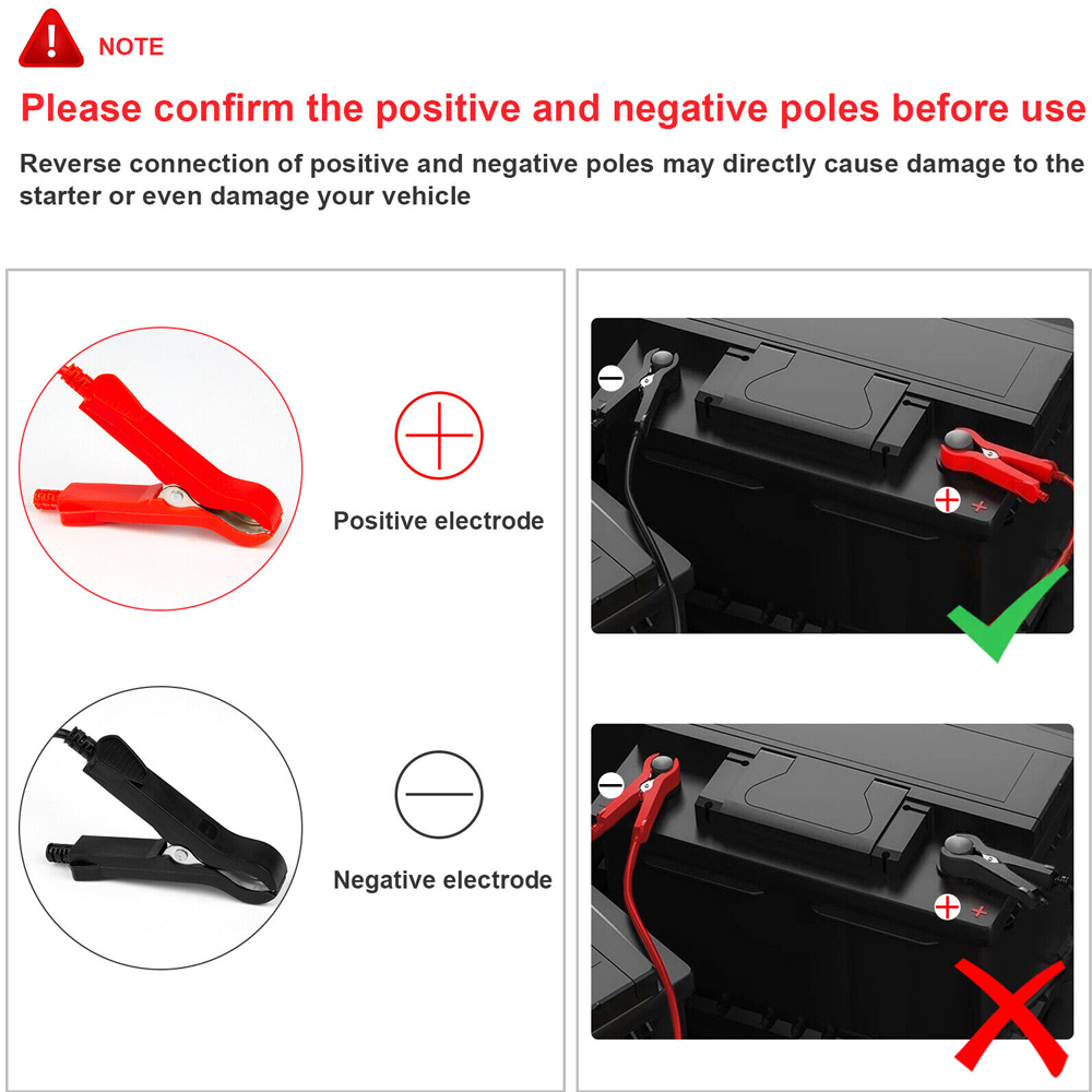 1.Connect the red clamp to the positive pole (+), black clamp to the negative pole (-).