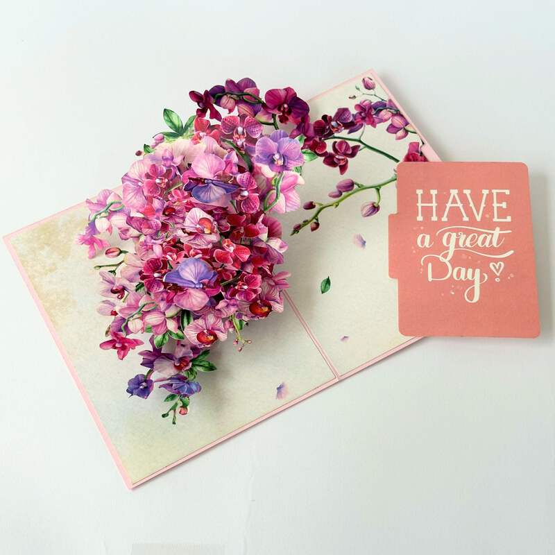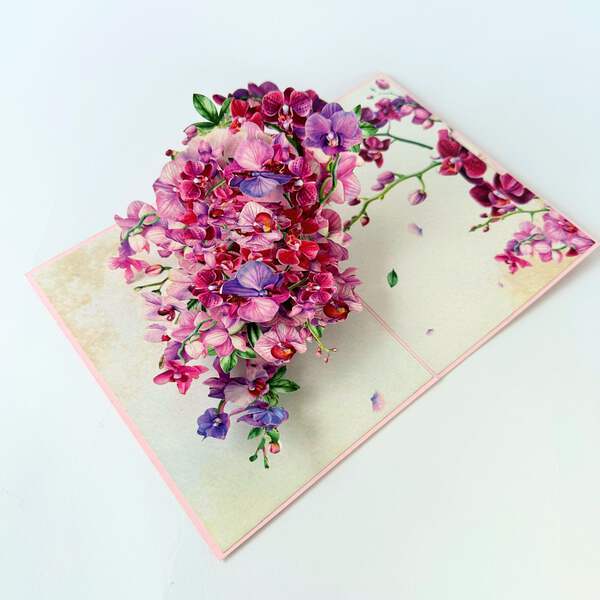 This gorgeous pop-up card features a vibrant purple orchid blooming flower to express love and gratitude. Perfect for nature lovers and as a gift for Mom on Mother's Day or a birthday. Show your appreciation with this unique and thoughtful card.