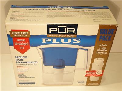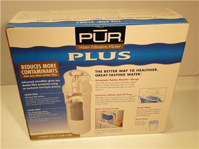 This is for an older unused PUR Plus Water filtration pitcher. Comes with 1 extra Microfilter. In original box. One of the top lid clips is broken off, still stays in place well. Removes microbiological cysts. Reduces more contaminants than any other pitcher filter. For your use.