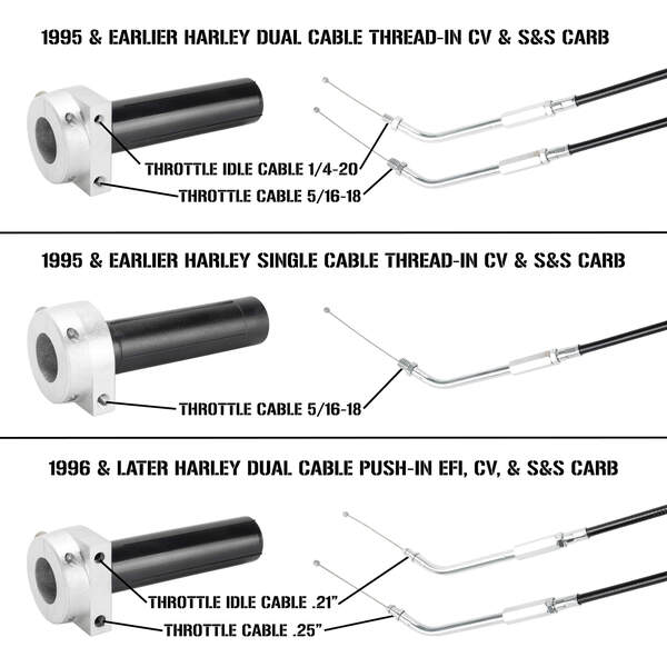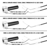 Our throttle housings include a Cycle Standard single cable throttle tube and will also work with stock Harley-Davidson throttle tubes, aftermarket dual cable throttle tubes, and aluminum Biltwell Whiskey Throttle Tubes (This housing will work with a single or dual cable throttle tube even when just using one cable). This throttle housing can be uséd on any motorcycle using a common screw-in cable. The hole is for a pull cable and is 5/16-18 thread pitch. Made in the USA.