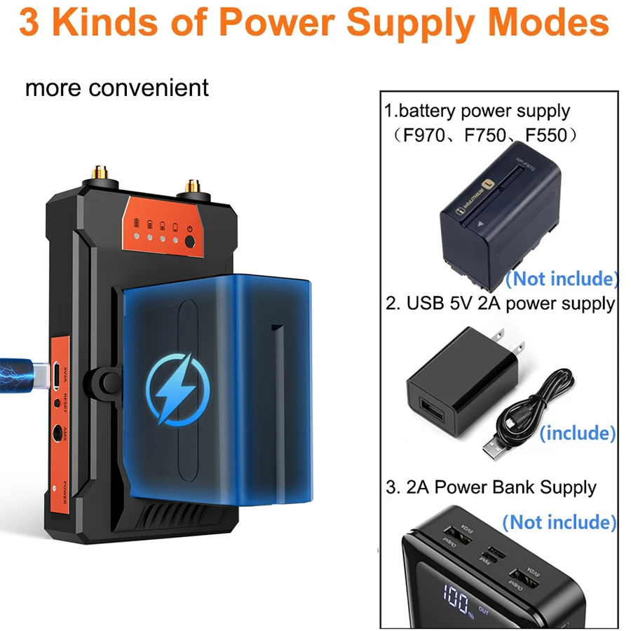 -Three Charging Ways: 5V/2A DC power input, 5V/2A Portable charger input, NP-F series battery input.