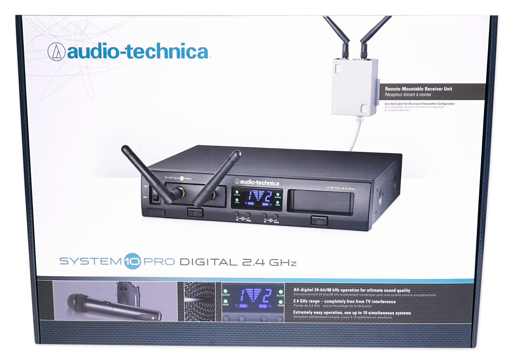Audio-Technica’s System 10 PRO Rack-Mount digital wireless system provides the same interference-free operation in the 2.4 GHz range (outside TV bands) as the original System 10 wireless system but with expanded features and versatility. The durable half-rack chassis is equipped to house two receiver units that can be operated locally or released from the chassis and mounted remotely (up to 328 feet away) via Ethernet cable. Up to five chassis (10 receiver units) can be linked using the RJ12 cable included with each system, creating a stable, multichannel system with the simultaneous use of up to 10 channels.