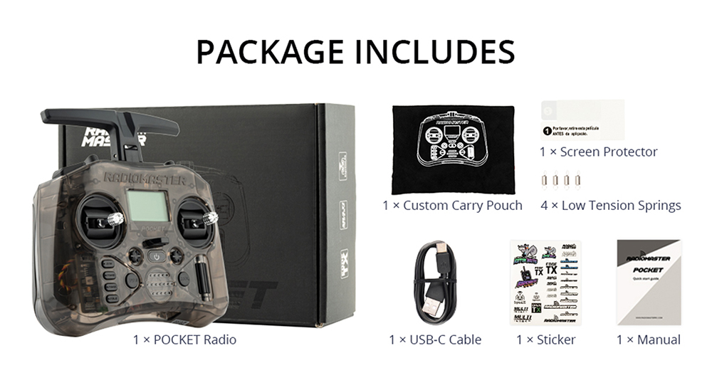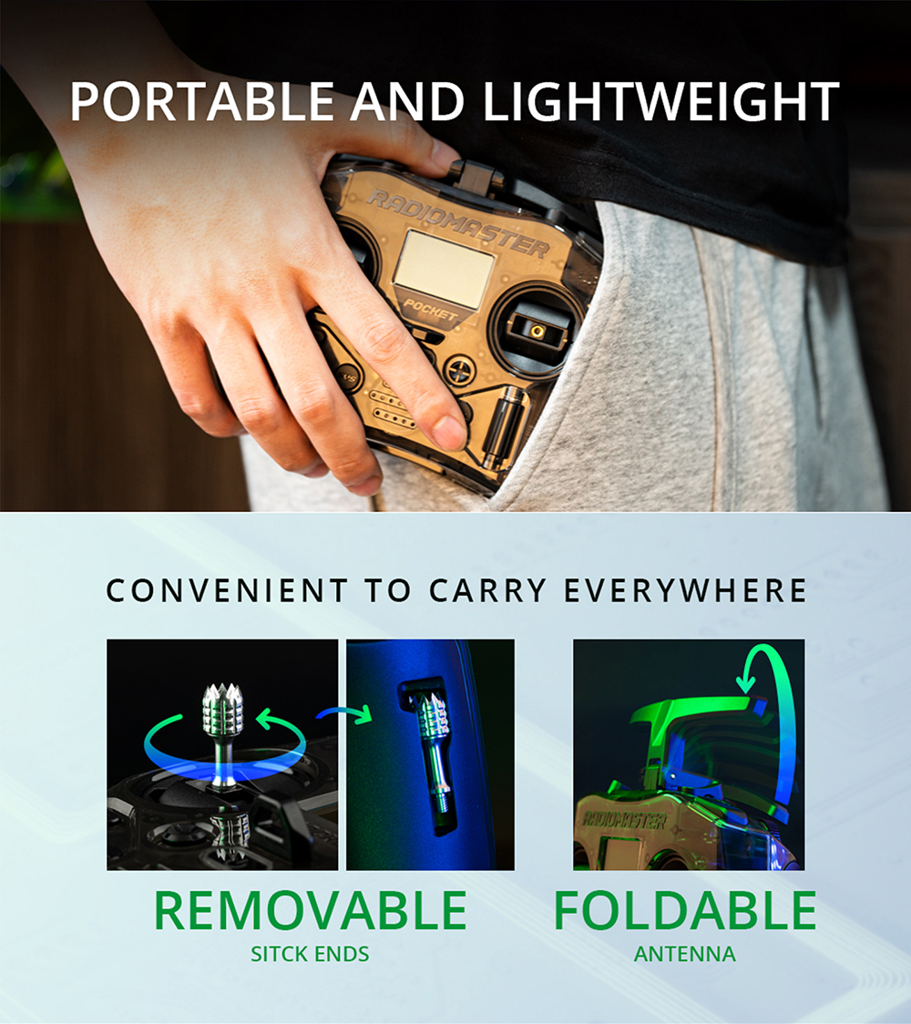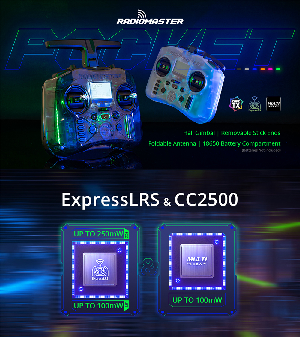 The RadioMaster Pocket is a small, lightweight radio that packs a big punch. With 2 versions, ExpressLRS and MPM CC2500, and both versions come preinstalled with EdgeTX firmware. The Pocket is also equipped with removable stick ends and a foldable antenna, making it easy to transport and store. It is compatible with batteries, which provide long battery life for hours of fun.