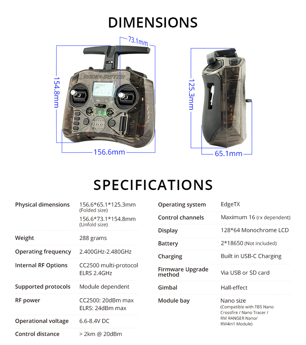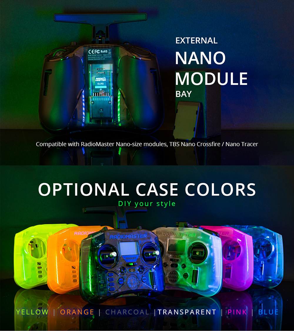 Module bay: Nano size (Compatible with RadioMaster Nano-size modules, TBS Nano Crossfire / Nano Tracer )