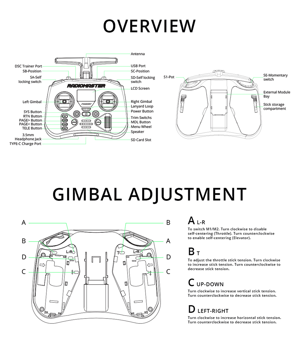 Available in ExpressLRS and MPM CC2500 versions. Preinstalled with EdgeTX firmware. Fit for Batteries, all the power you need for hours of fun. Simply connect the TypeC jack at the bottom of the remote control to charge.