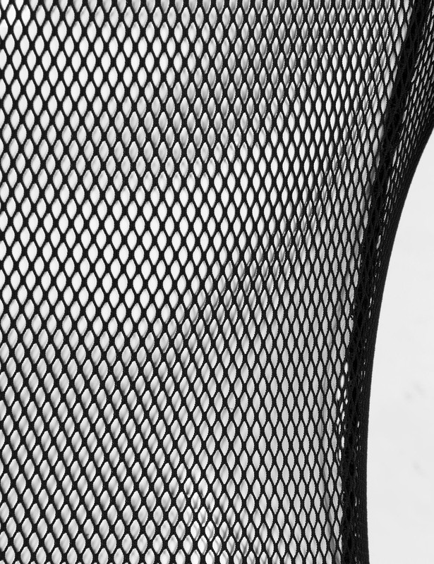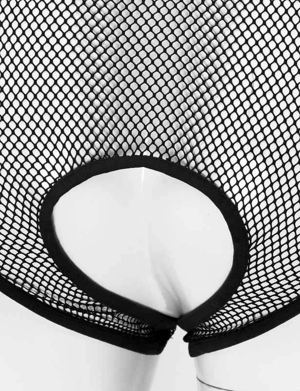 See through fishnet design, sleeveless, scoop neckline and open crotch, well shows off muscles.