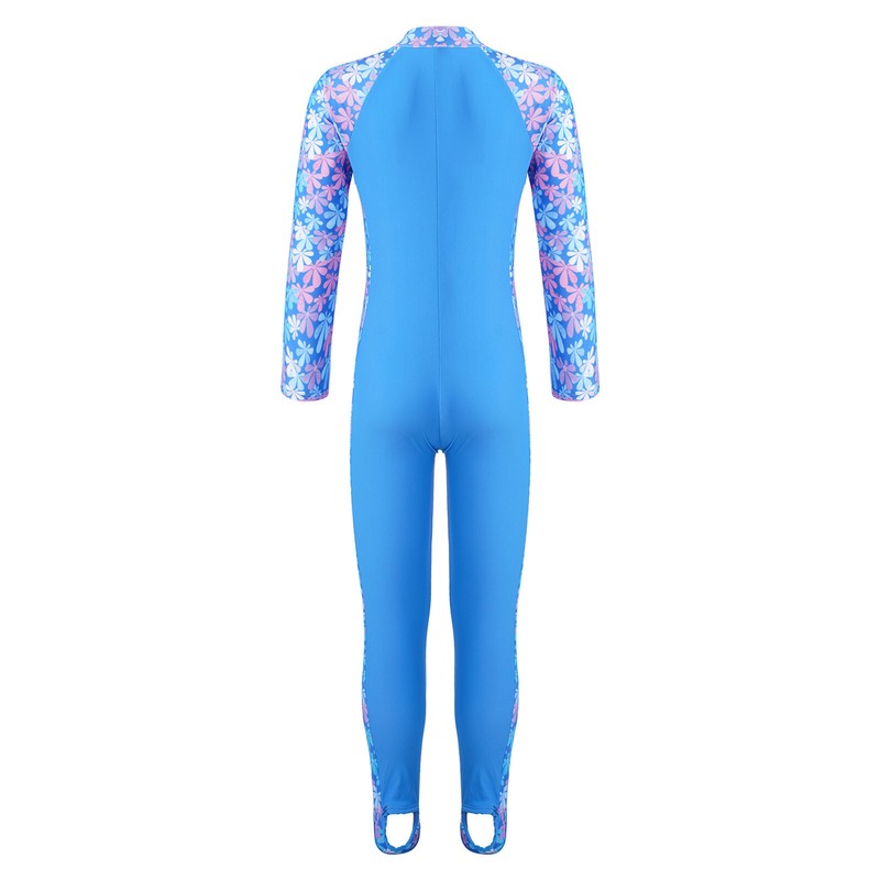 Floral printed long sleeves, left chest printed with letters "summer fun" and rainbow pattern, front zip closure. Foot stirrups design keep swimsuit in place.