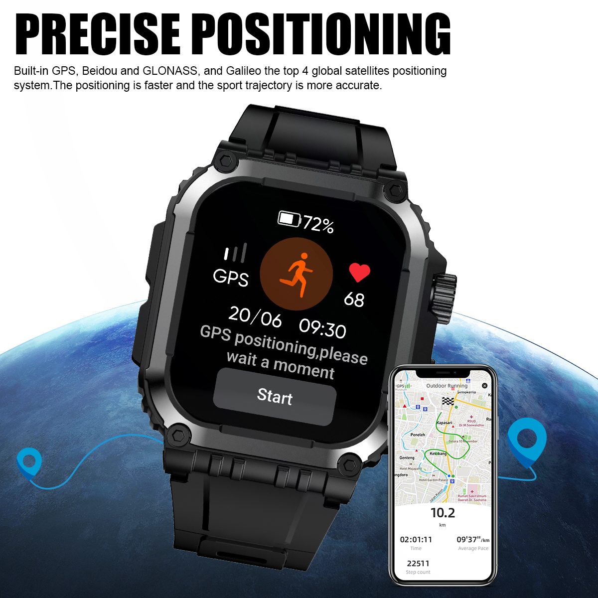 1. Accurate positioning: Built in GPS, Beidou, GLONASS, Galileo four major global satellite positioning systems, more accurate positioning of motion trajectory, view the entire motion trajectory on the watch adapted APP;