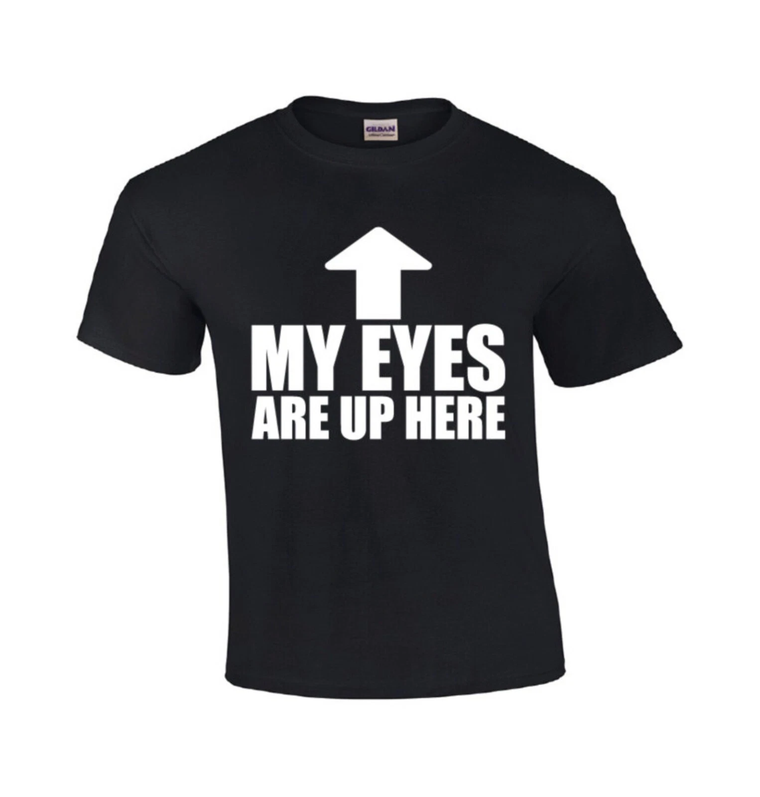 “MY EYES ARE UP HERE” and an upward arrow for a cheeky, attention-grabbing look. Made from soft cotton by Gildan, this novelty shirt is perfect for casual outings, parties, or as a hilarious gift for friends.