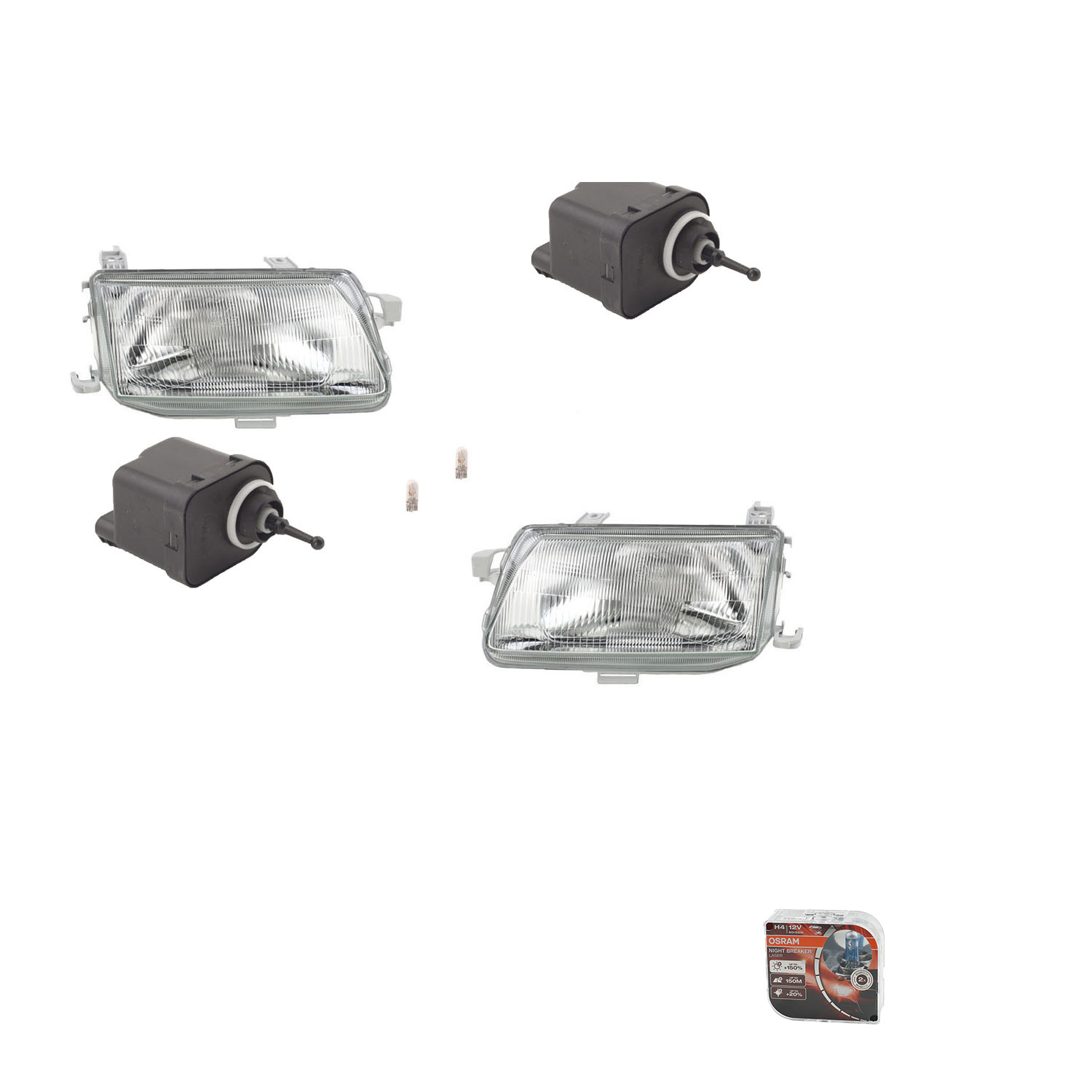 SCHEINWERFER mit abgebildeten Leuchmitteln inklusvie Osram Night Breaker Laser Leuchtmitteln mit Stellmotor mit n H4 Set links & rechts, links und rechts als Paar (beide Seiten im Lieferumfang enthalten), Baujahr: 09/94-09/98 Vergleichsnummer(n): Passend für: