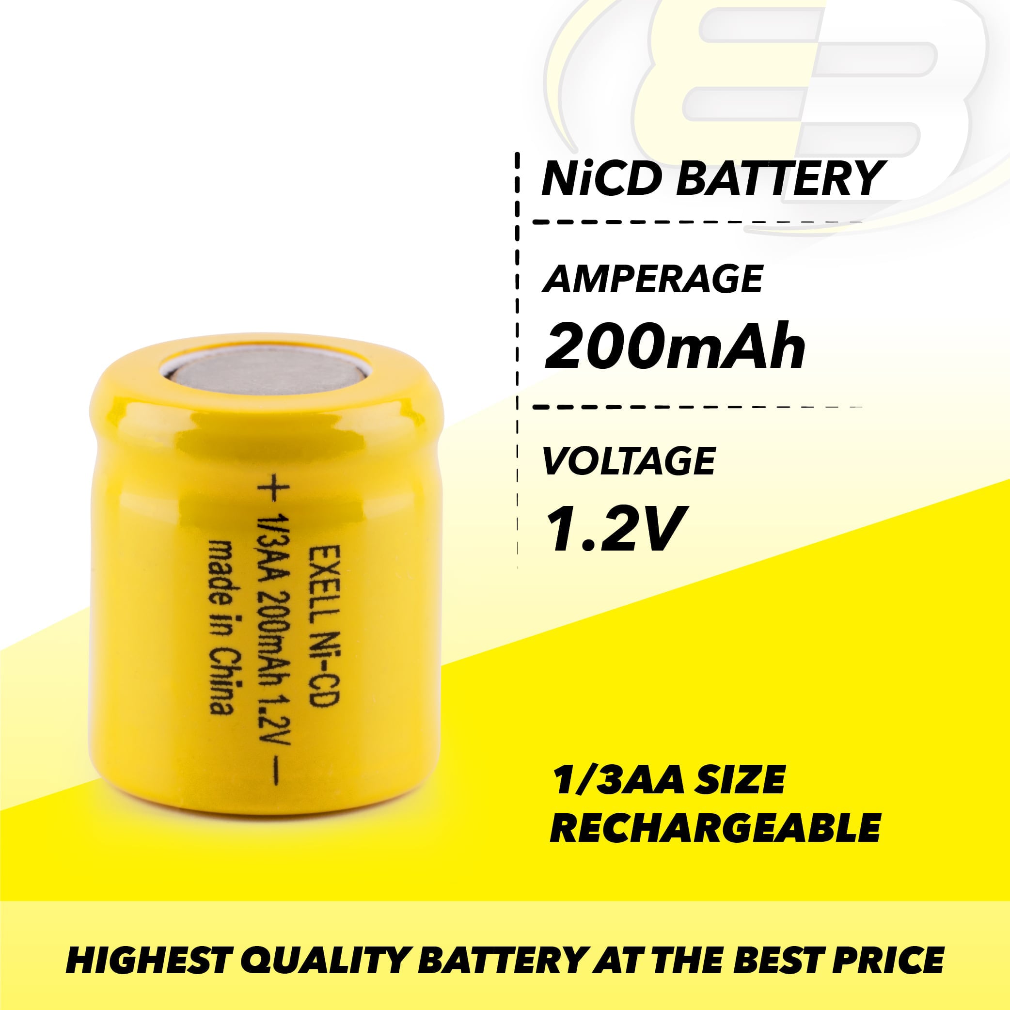 Exell 1/3AA NiCD 200mAh 1.2V Flat Top Rechargeable Battery are excellent for building custom battery packs. If you are a novice or an old pro, these batteries will keep you powered up. These batteries can be recharged 500-1000 times giving you years of use. These high quality rechargeable Nickel Cadmium (Ni-Cd) batteries are exact Compatible Withs for standard battery in all the device. Provides ultra long use time per charge. Designed for enhanced performance for high drain applications such as digital cameras, CD players, portable audio devices, hand held games, 2-way radios, PDAs, and other portable high drain digital electronics. Can be recharged for up to 700 times, providing big saving by replacing hundreds of throw away batteries. Can be rapidly charged with any quick charger, smart chargers, plug in charger or universal chargers.