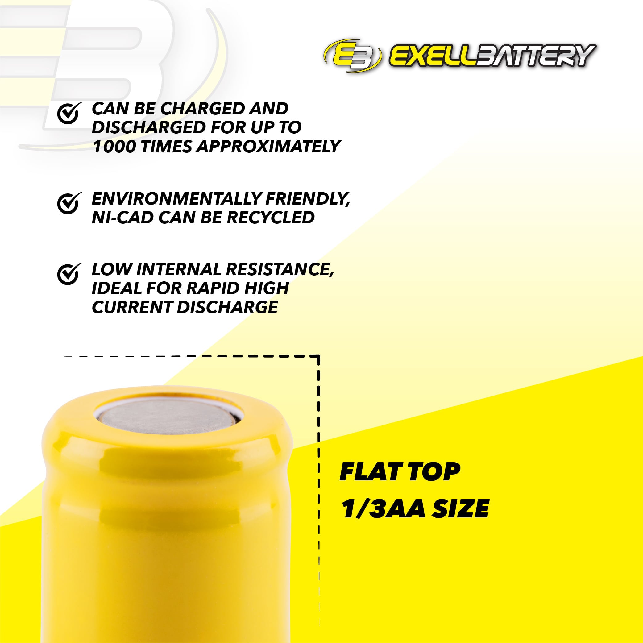 Exell 1/3AA NiCD 200mAh 1.2V Flat Top Rechargeable Battery SpecificationsIt is a good practice to do deep-discharge or complete discharge at least once 4 to 8 weeks. Deep discharge ( complete discharge ) is important for Ni-Cad not to develop memory effects. Compared with other types of rechargeable cells, Ni-Cad batteries offer good cycle life and performance at low temperatures with a fair capacity but its significant advantage is the ability to deliver practically its full rated capacity at high discharge rates (discharging in one hour or less)