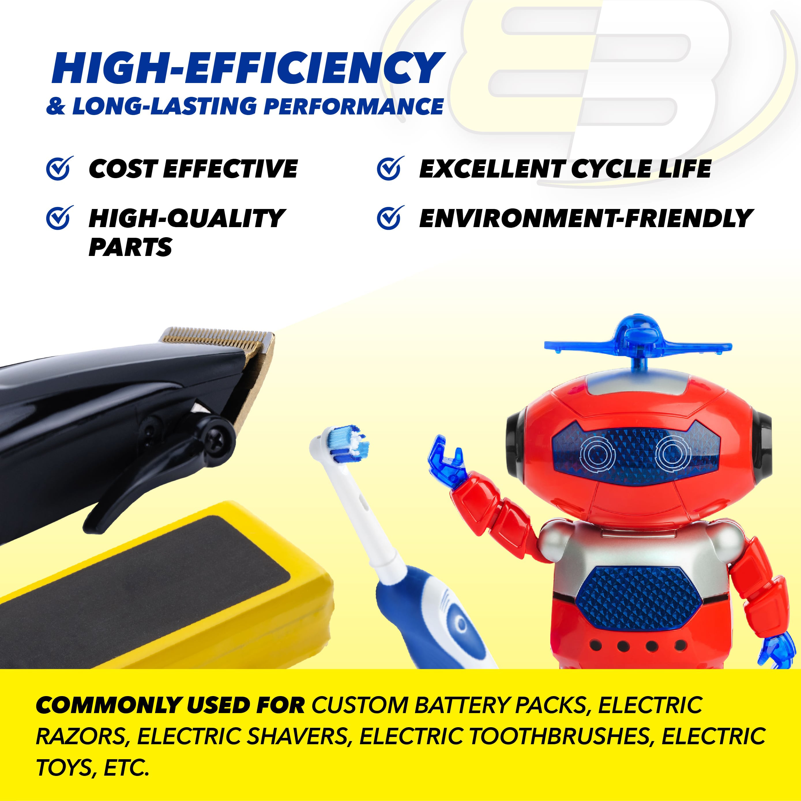 Consumer Applications: Widely used in radio controlled devices, electric tools and toys, electric mopeds, meters, two radios, hybrid automobiles, electric razors, toothbrushes, cameras, camcorders, mobile phones, pagers, instruments/equipment, high power static applications (Telecoms, UPS and Smart grid), and numerous other applications.