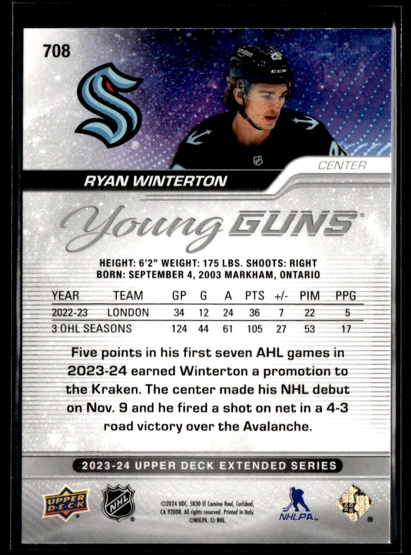 | 2023-24 Upper Deck Young Guns Ryan Winterton Rookie Seattle Kraken #708 |