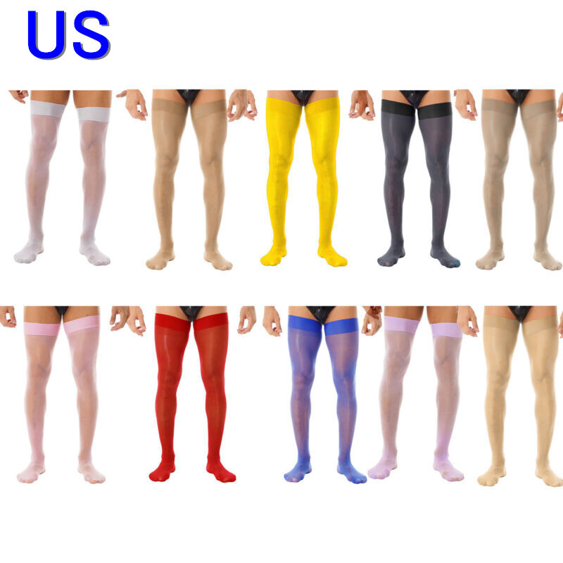 Men Glossy See-through Stockings Thin Shiny Solid Color Stretchy Sheer Thigh High Socks.