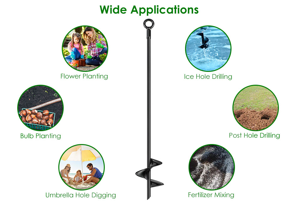 - Wide Application:Our spiral hole drill improves landscapers’ efficiency when planting bulbs,potted plants,vegetables,flowers,bare root trees and shrubs,tilling soil or planter boxes,mixing seed,soil,fertilizer,etc.. Our earth drill bit is also effortlessly to dig post holes or even bring it on vacation to drill a hole in sand to anchor your beach umbrella. A great helper for you.