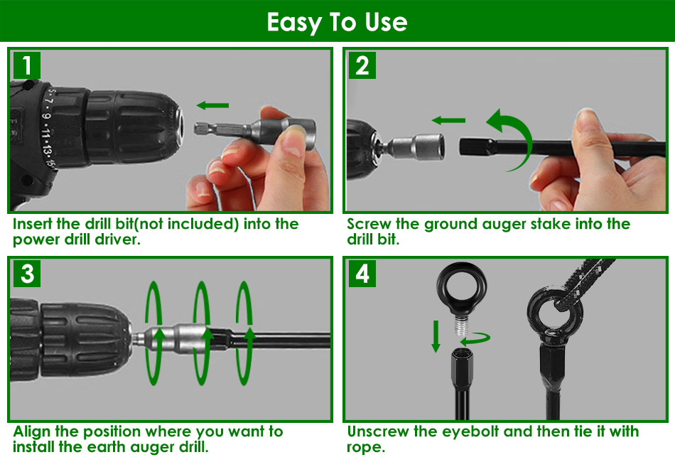 - Easy To Use:First,insert the drill bit(not included) into the power drill driver. Second,screw the ground auger stake into the drill bit. Third,align the position where you want to install the earth auger drill. Fourth,unscrew the eybolt and then tie it with rope.