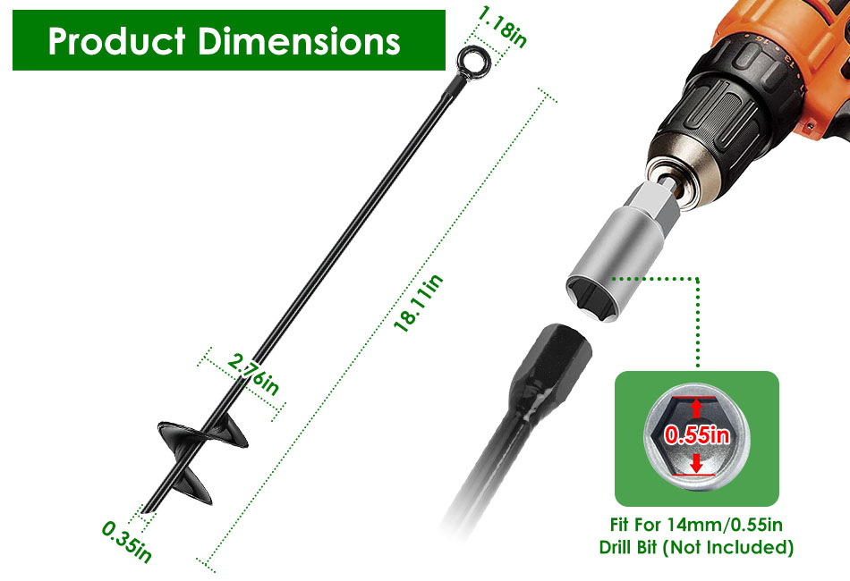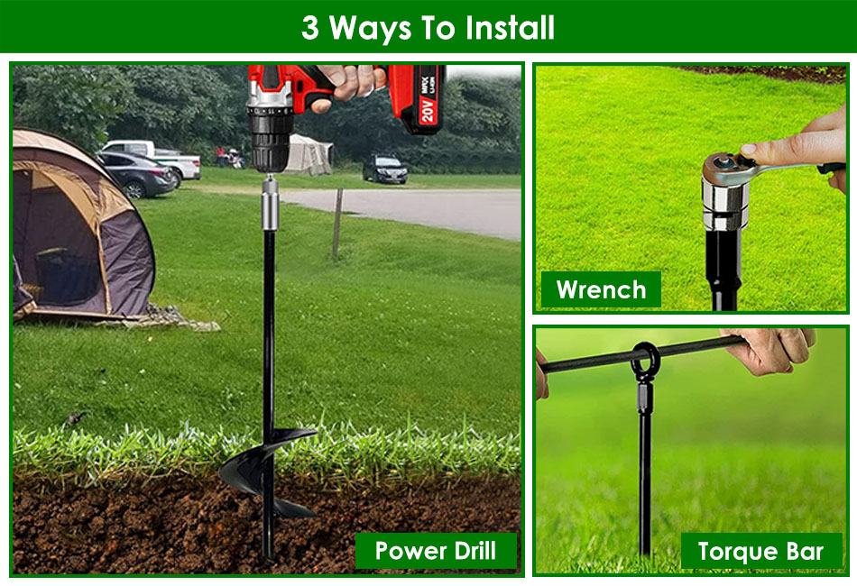 - 3 Ways To Install:Our ground augers can easily drive down with power drill,torque bar and wrench. Fit for all power drills and 14mm/0.55in drill bit. Note:Power Drill and Drill Bit Not Included.