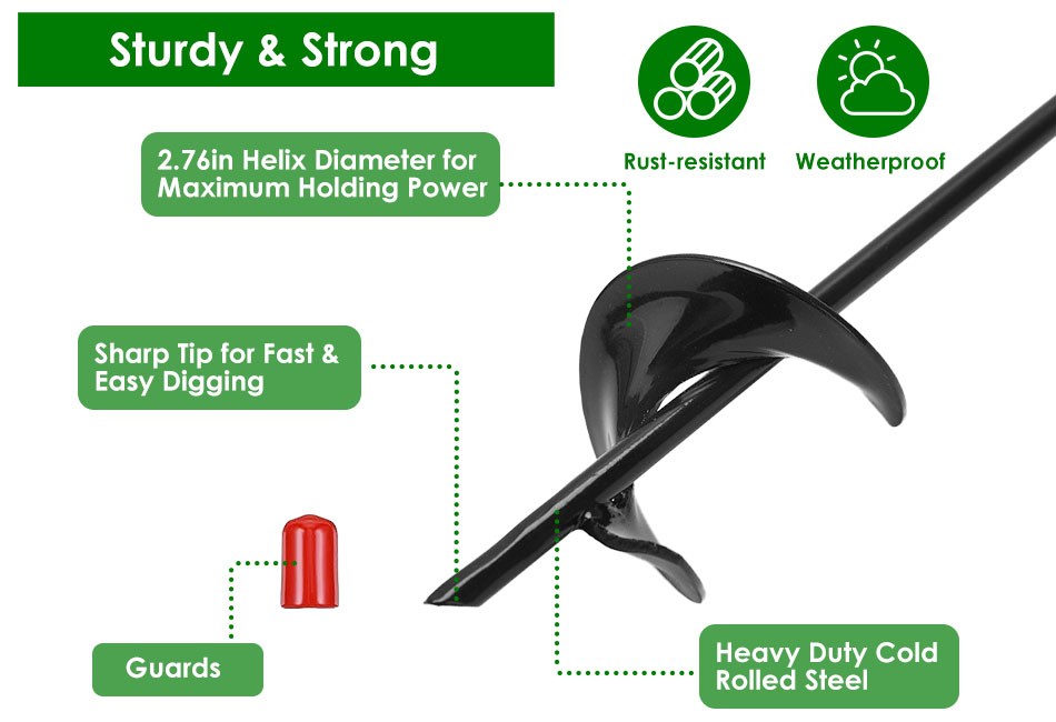 GOOD QUALITY Product Detail Image Gallery Product DescriptionOverview:Made of heavy duty cold rolled steel and featured with 7cm/2.76in helix diameter, these auger stakes are sturdy and strong enough to ensure maximum digging performance, which can be inserted deeper into the ground. A great helper to improve landscapers’ efficiency when planting bulbs, potted plants, vegetables, flowers, bare root trees and shrubs, tilling soil or planter boxes, mixing seed, soil, fertilizer, etc.. Our ground augers can easily drive down with power drill, torque bar and wrench. Fit for all power drills and 14mm/0.55in drill bit. Comes with 4 packs, the sufficient quantity enough to meet your daily use and replacement needs. Features:- Sturdy & Strong:Made of heavy duty cold rolled steel with black coating,these auger stakes are sturdy and strong enough to keep itself steady when digging grounds. Resistant to corrosion or rust,not easy to break,deform or bend,these posthole diggers can retain its color and shape after longtime use. Note:Please wet ground before digging for good result.