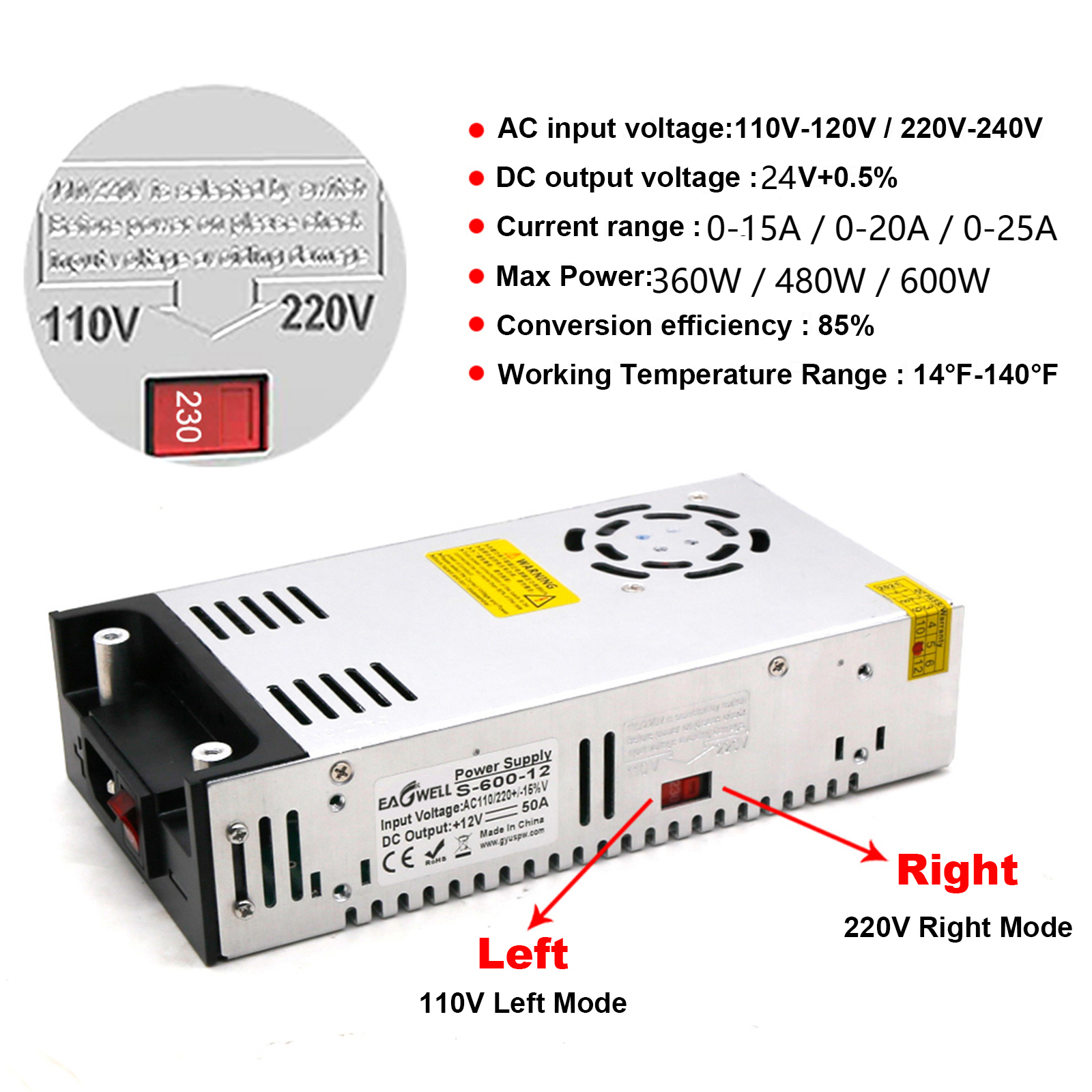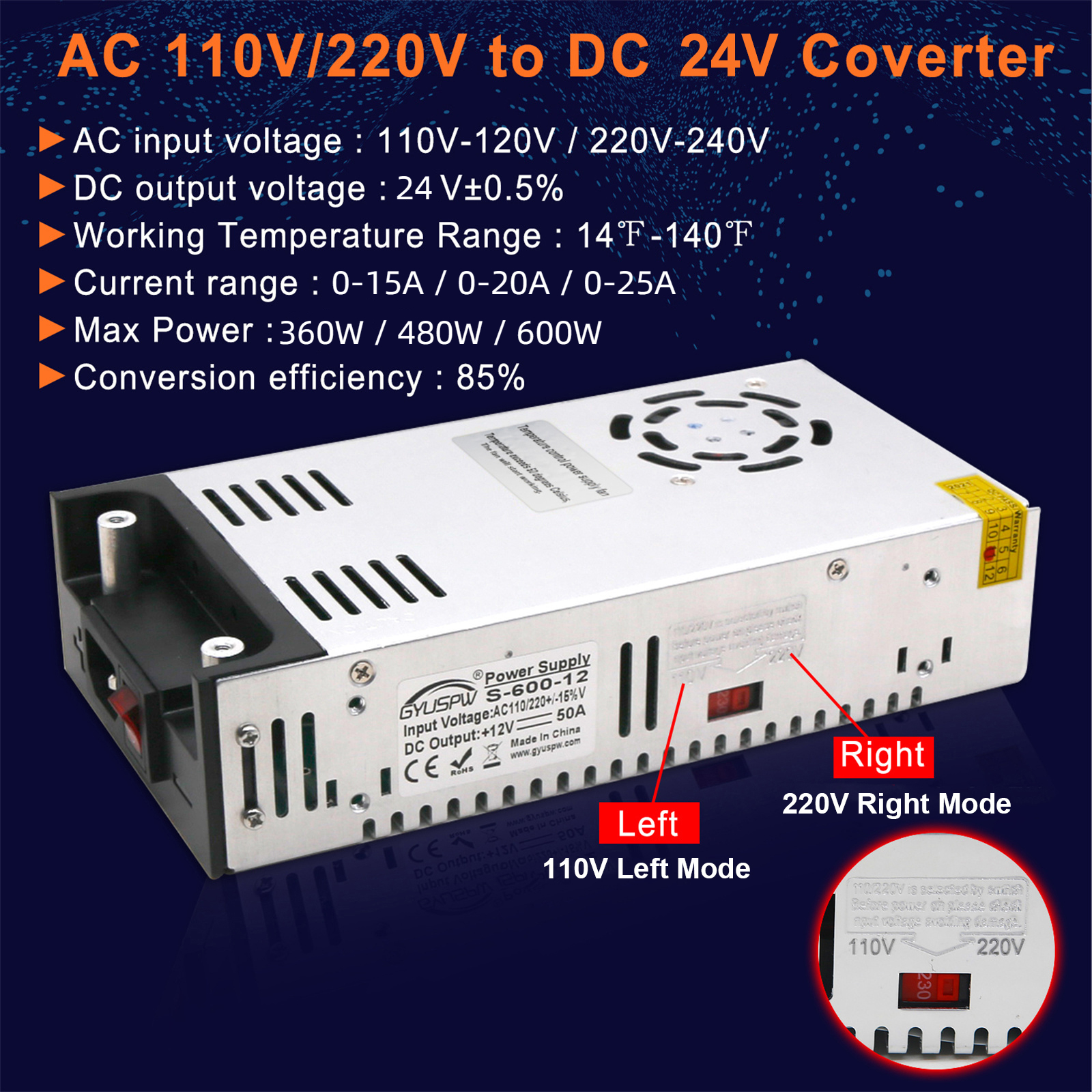- Input Voltage Support AC 110V-120V / 220V-240V , Output Range (24V 1A-5A, 24W-120W ) or (24V 10A-20A 240W-480W) ,voltage input will adjust automatically to SMPS Model ,Output current Mainly depends on your decive, such as 5A 120W, 10A 240W, 15A 360W, Max current up to 25A,Power 600W.
