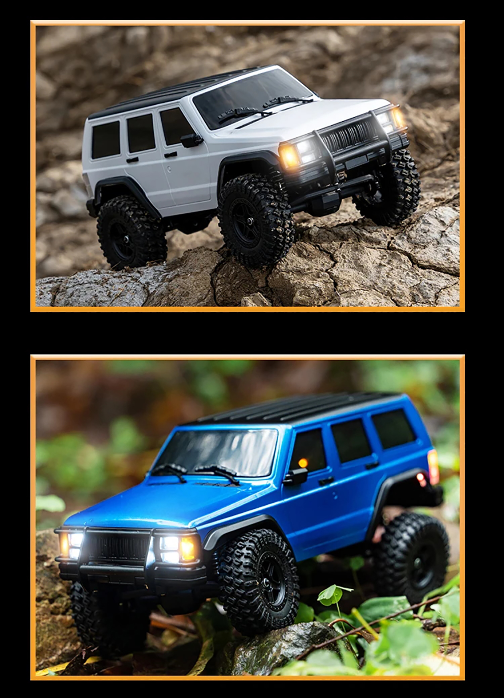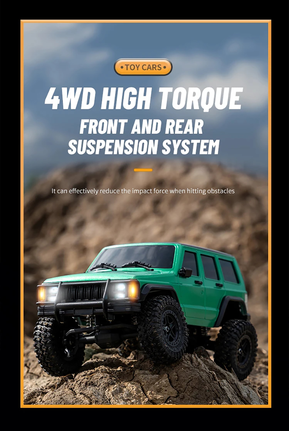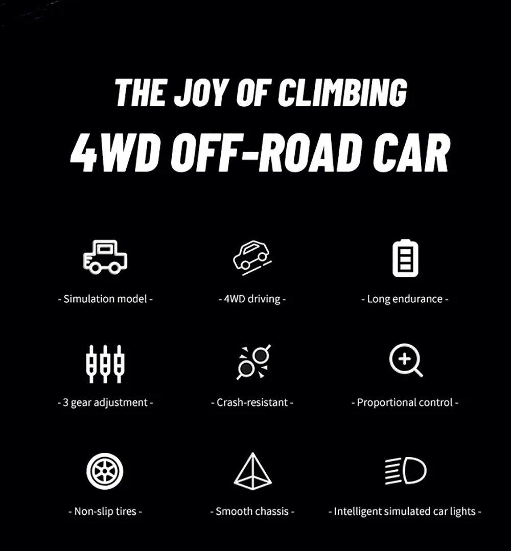 The 1:18 RC Car 4WD rock crawl car with 2.4GHz frequency remote control,external carbon brush 370 motor and 20A waterproof blushless. It is a hardcore off-road vehicle that takes you through the unknown, conquers horizons, and explores endless possibilities.