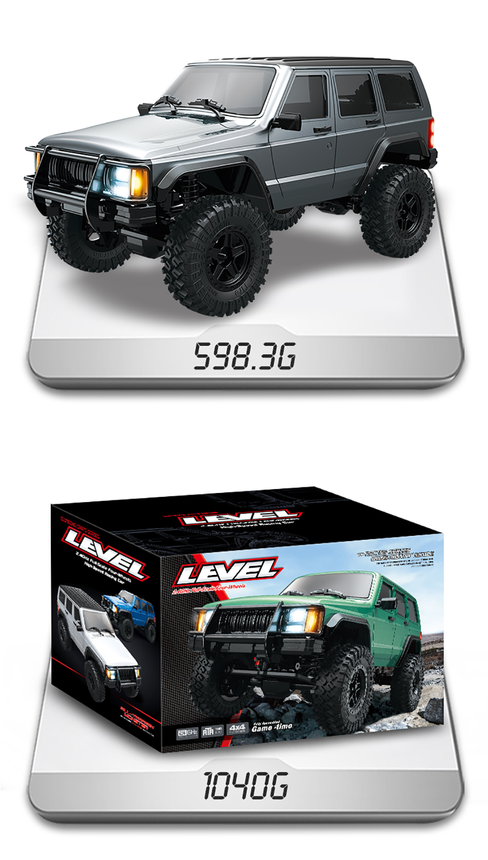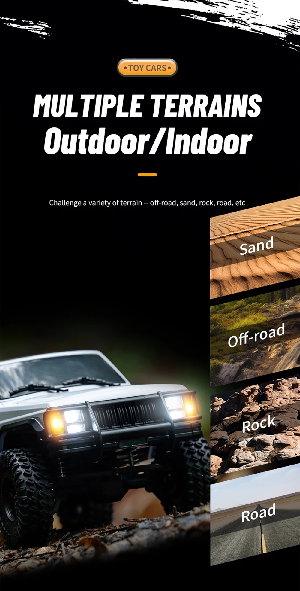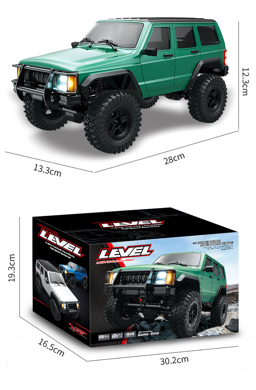 The 1:18 RC Car 4WD rock crawl car with 2.4GHz frequency remote control,external carbon brush 370 motor and 20A waterproof blushless. It is a hardcore off-road vehicle that takes you through the unknown, conquers horizons, and explores endless possibilities.