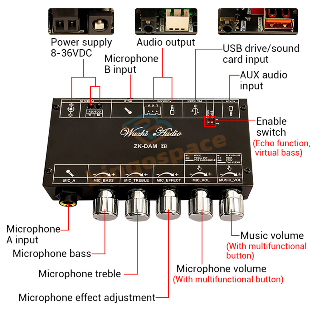 3. Dual microphone interface, digital reverb, dynamic anti-whistling