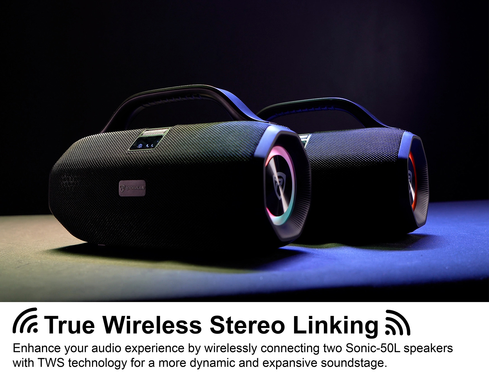 The Rockville SONIC-50L is a large and loud portable Bluetooth speaker that delivers deep bass and great frequency response. This speaker is engineered to produce an extremely pleasant sound curve that is sure to impress. With large-sized speakers and 2 passive bass radiators, this device is capable of producing deep bass frequencies and very loud overall volume. The TWS - True Wireless Stereo Linking feature allows you to connect two speakers wirelessly for an even more immersive audio experience.