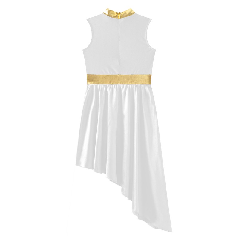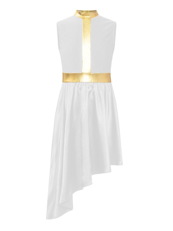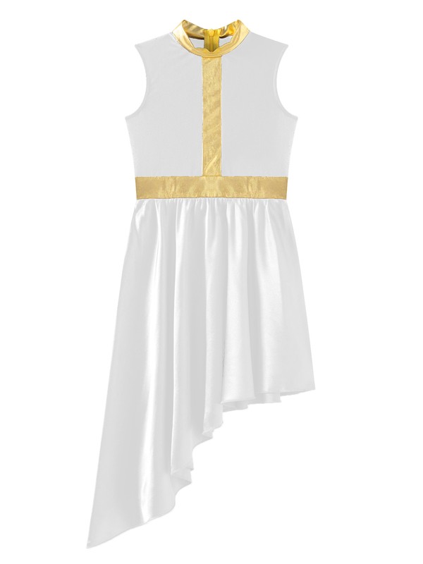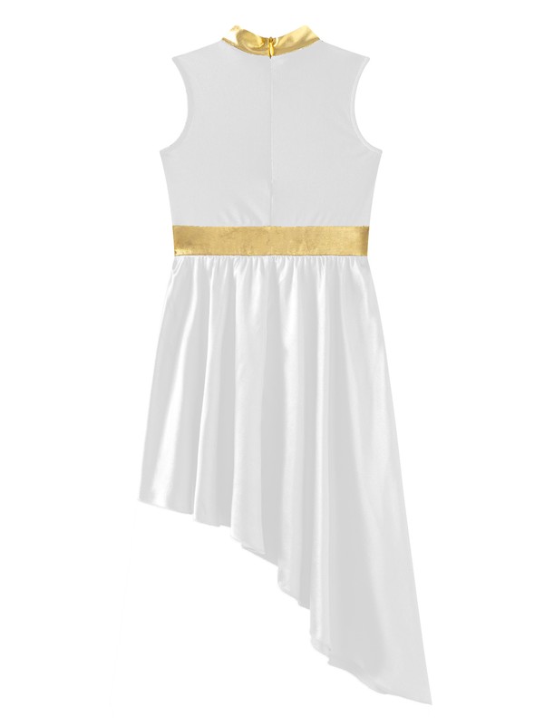 Sleeveless dance dress for girls, color block patchwork design, flowy asymmetrical satin skirt shows the softness and beauty of dance.