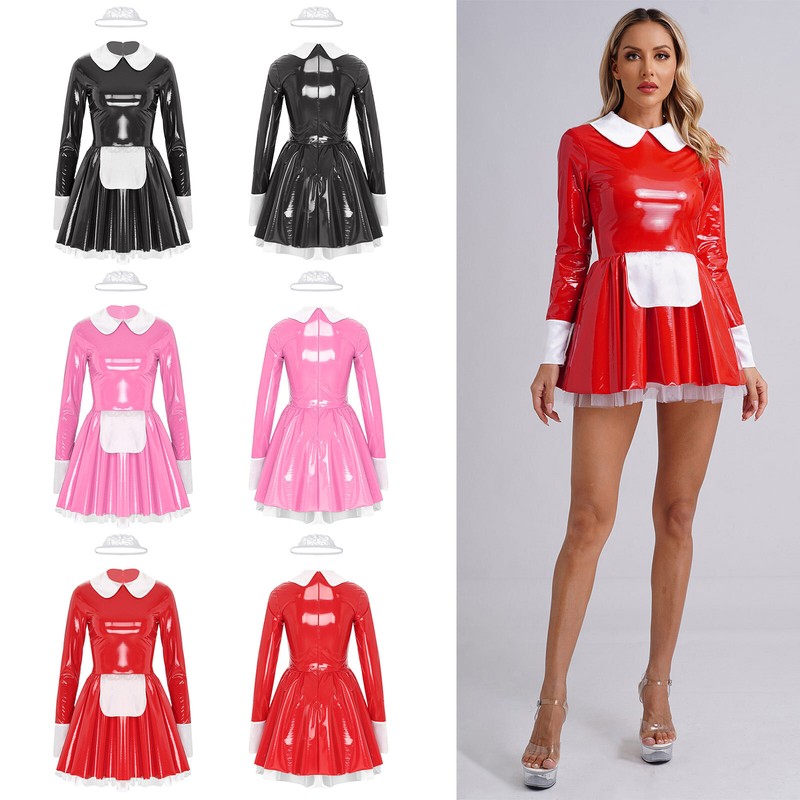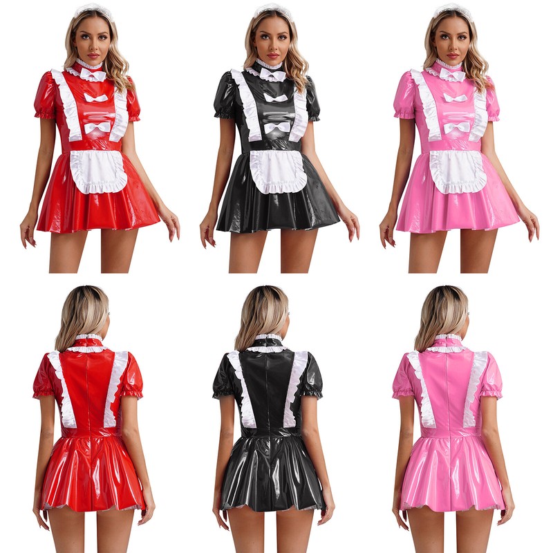 Ladies V Neck Short Sleeve Patent Leather Lace Trimming Maid Fancy Dress Costume.