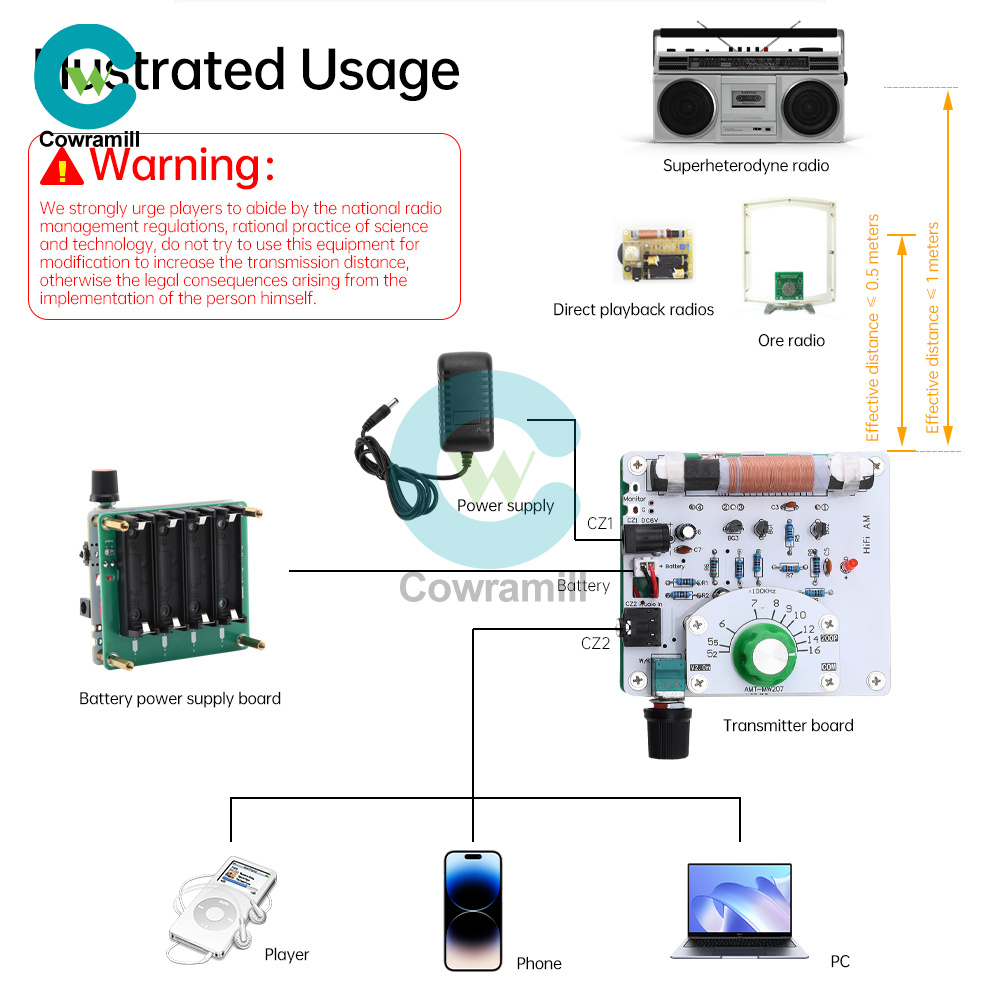 Transmitting distance: about 1 meter for super-aberrant medium wave radio, about 0.5 meter for direct and crystal radio.